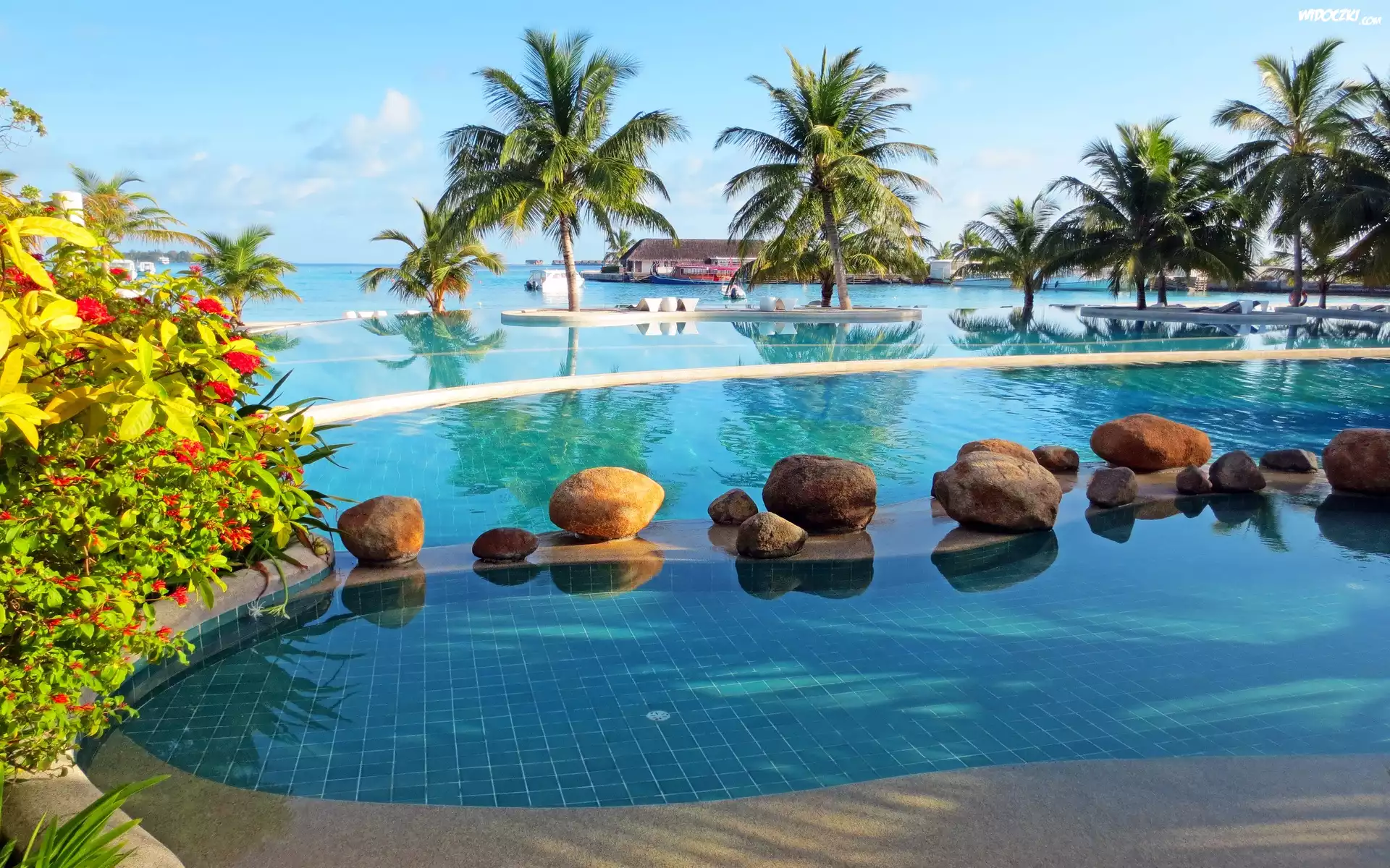 Zdjęcia, Tropiki, Malediwy, Morze, Wyspa, Plaża, Kurort, Basen, Palmy
