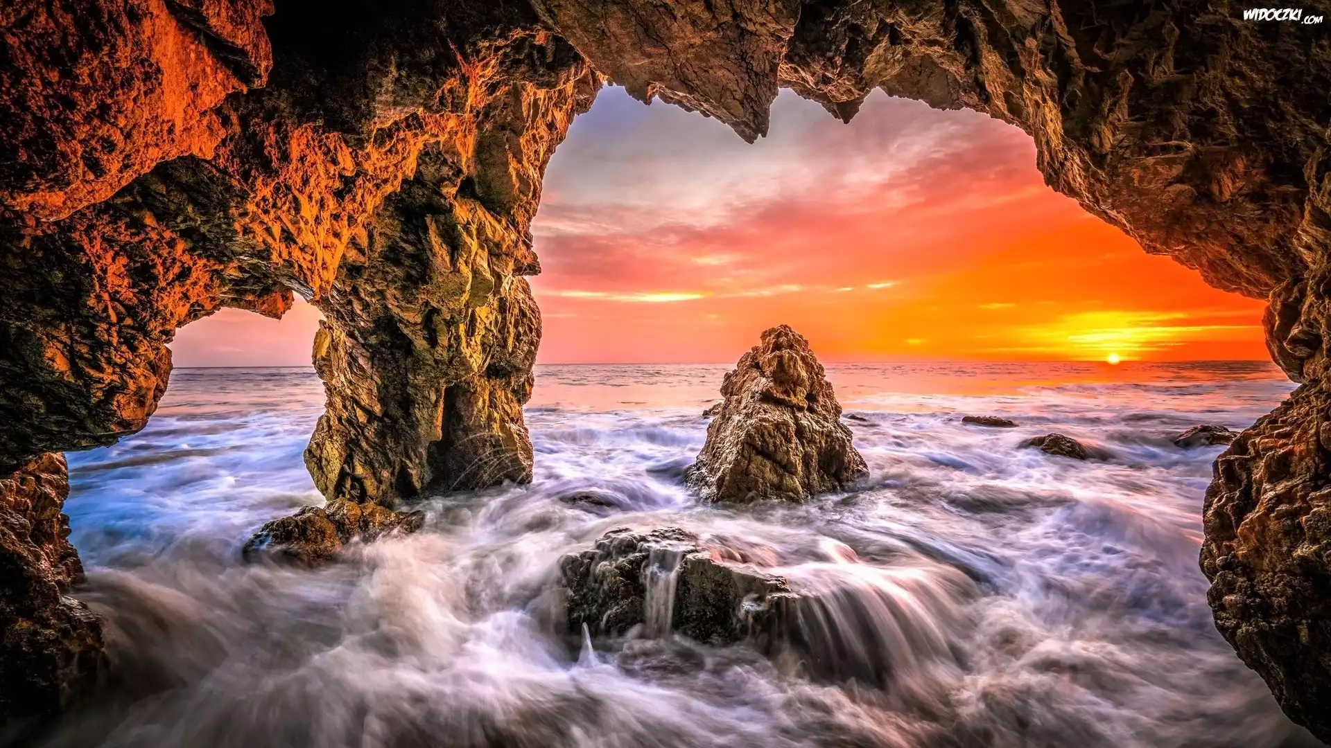 Morze, Jaskinia, Skały, Zachód słońca, Malibu, Hrabstwo Los Angeles, Kalifornia, Stany Zjednoczone |
