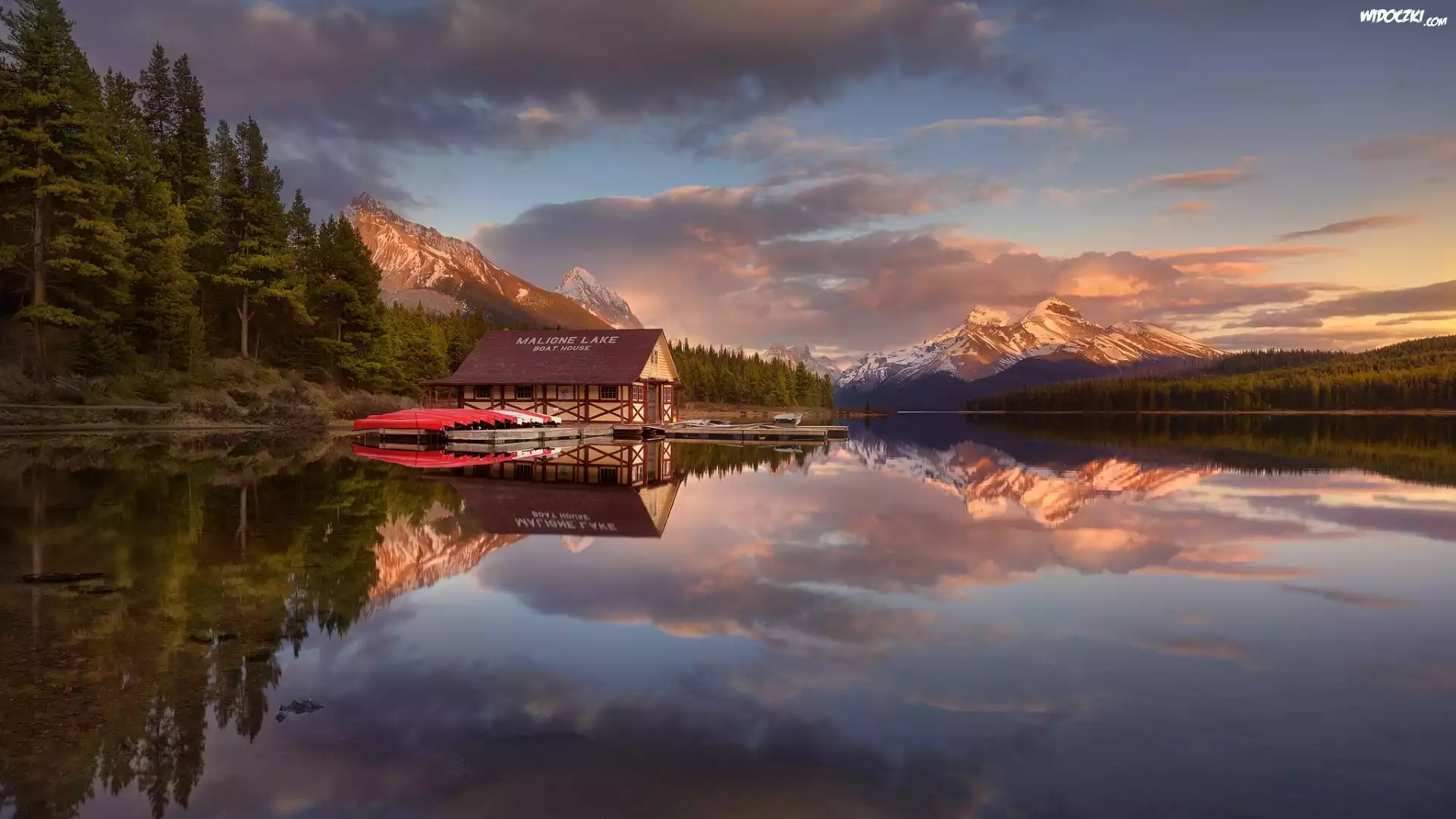 Zdjęcia, Kanada, Park Narodowy Jasper, Jezioro Maligne, Przystań, Góry, Las, Drzewa, Łódki, Odbicie