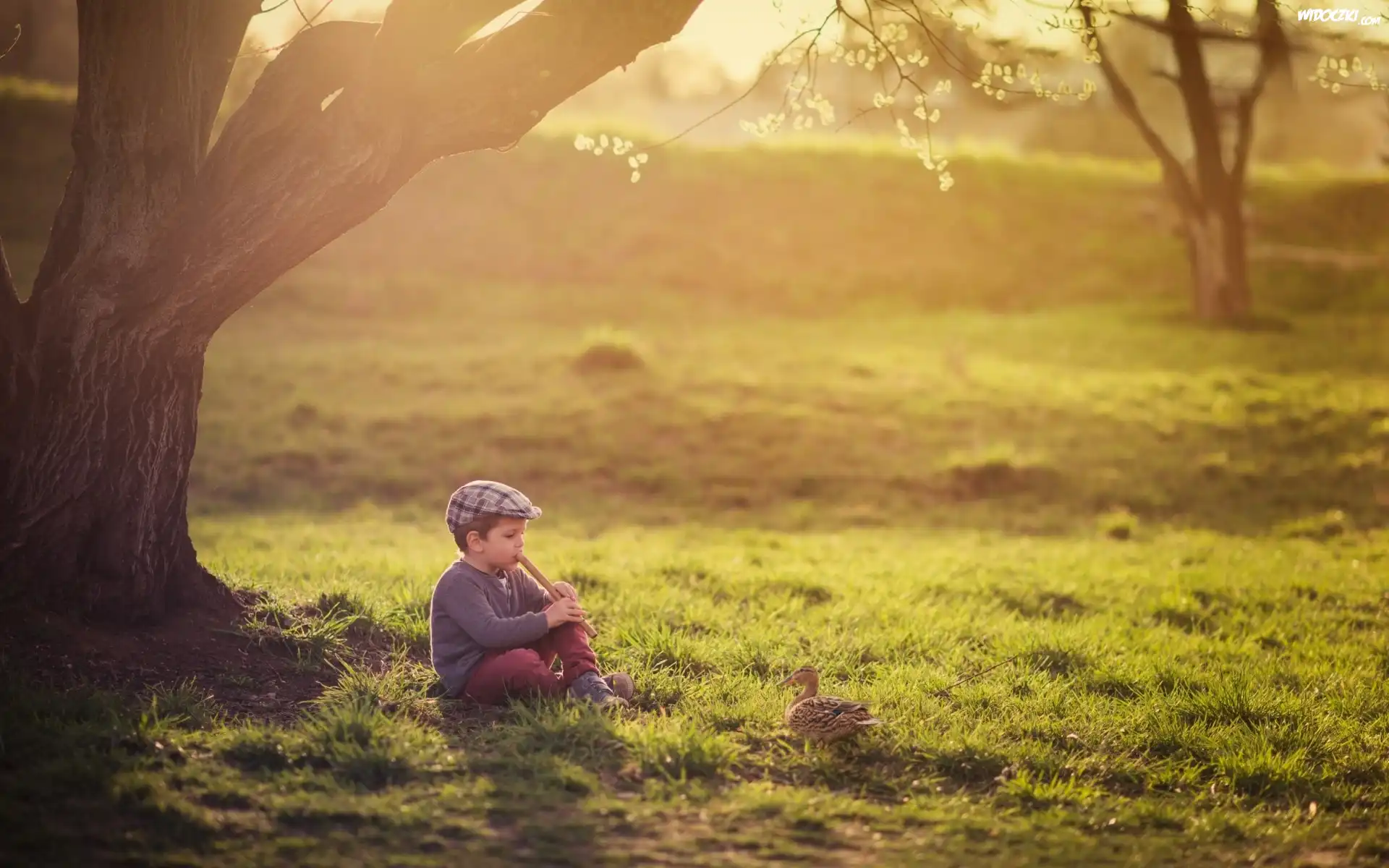 Zdjęcia, Mały, Chłopczyk, Kaczuszka, Fujarka, Łąka, Drzewa