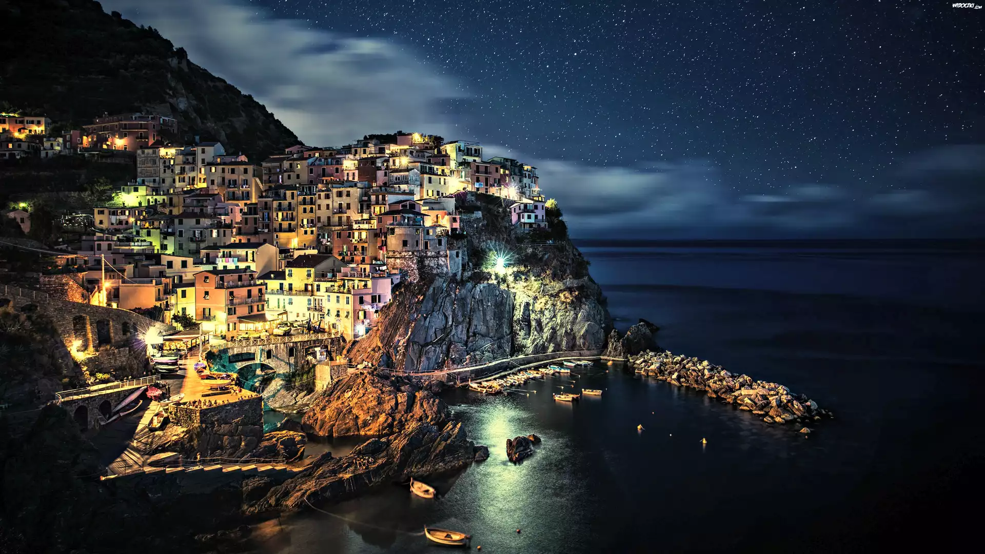 Zdjęcia, Manarola, Włochy, Zatoka, Morze, Skały, Noc