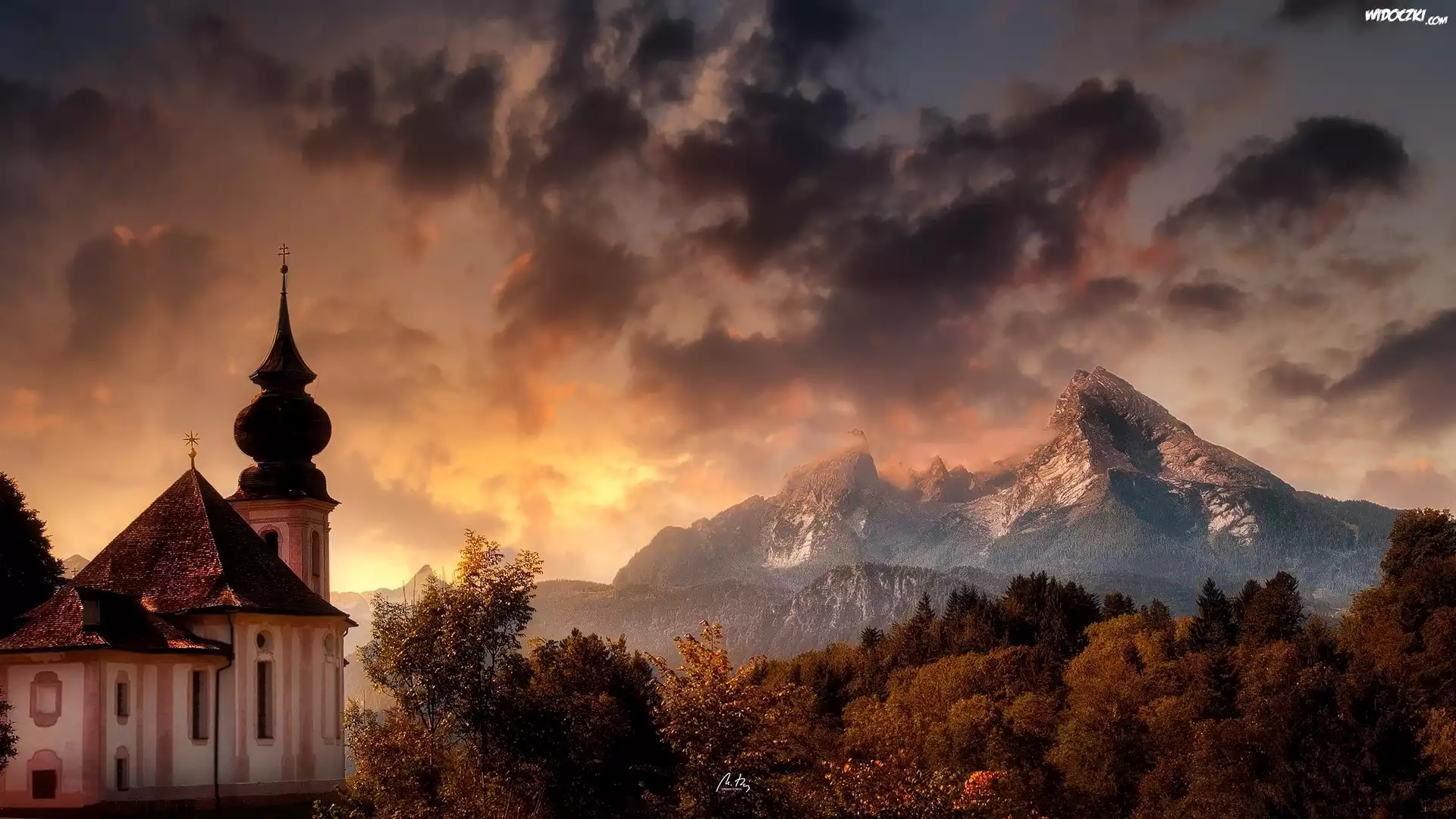 Zdjęcia, Kościół, Sanktuarium Maria Gern, Berchtesgaden, Bawaria, Niemcy, Góry, Alpy Salzburskie, Drzewa