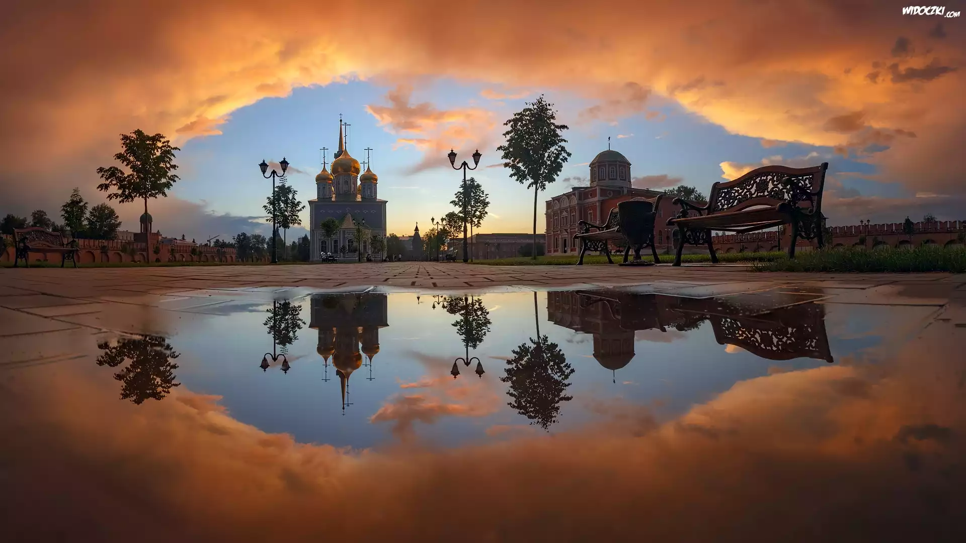 Zdjęcia, Cerkiew, Sobór Zaśnięcia Najświętszej Maryi Panny, Latarnie, Ławki, Drzewa, Chmury, Kałuża, Odbicie, Tuła, Rosja