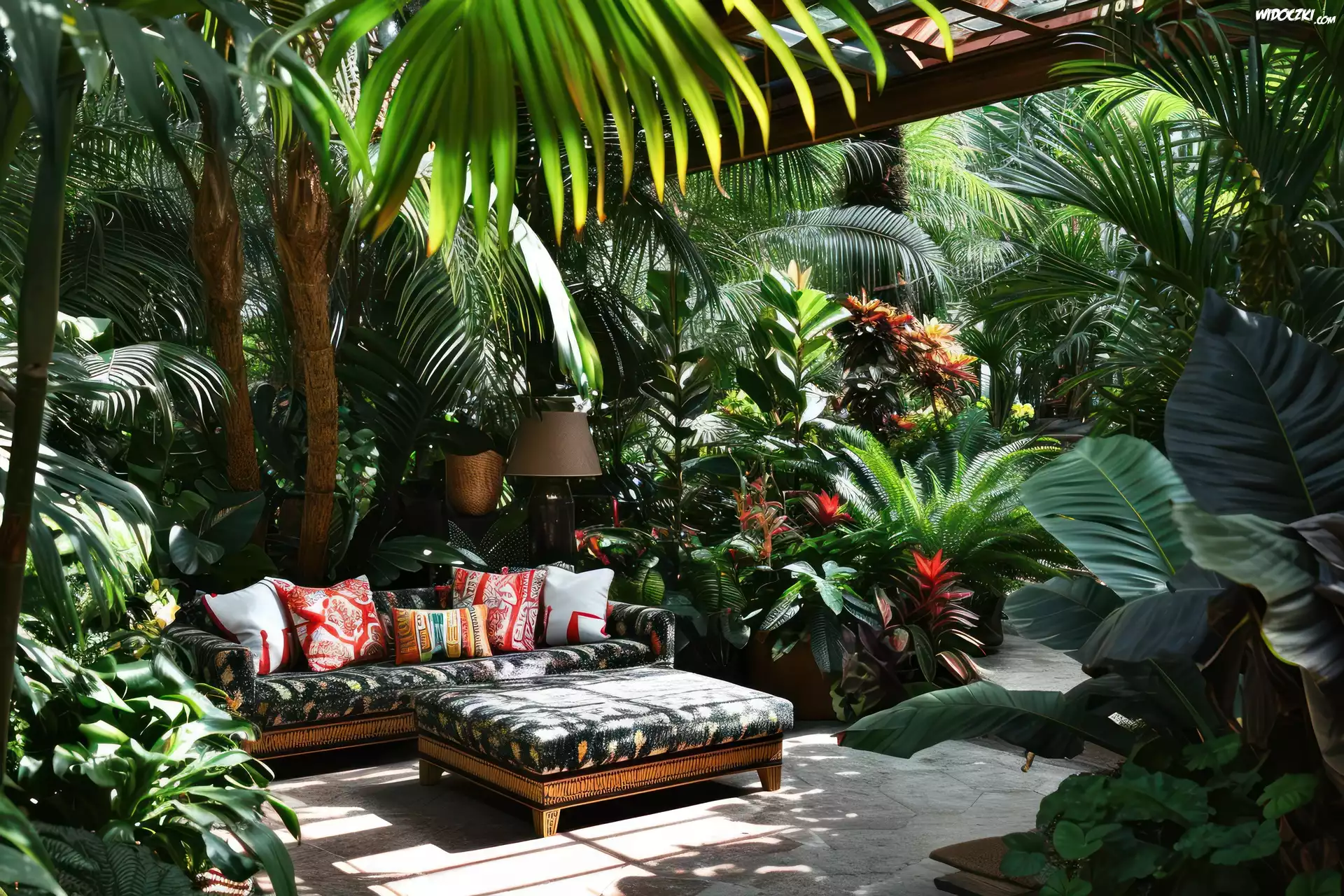 Ogród, Kwiaty, Palmy, Meble, Kącik wypoczynkowy