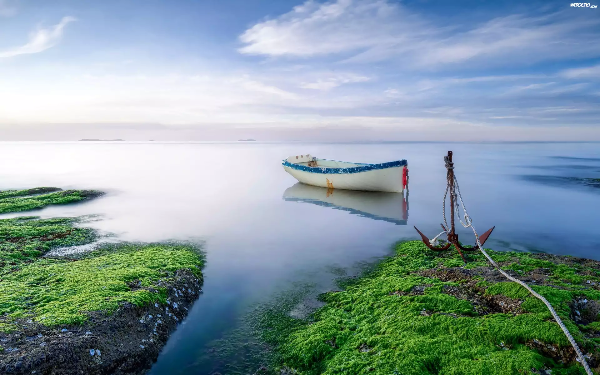 Zdjęcia, Łódka, Jezioro, Kotwica, Mech, Poranek