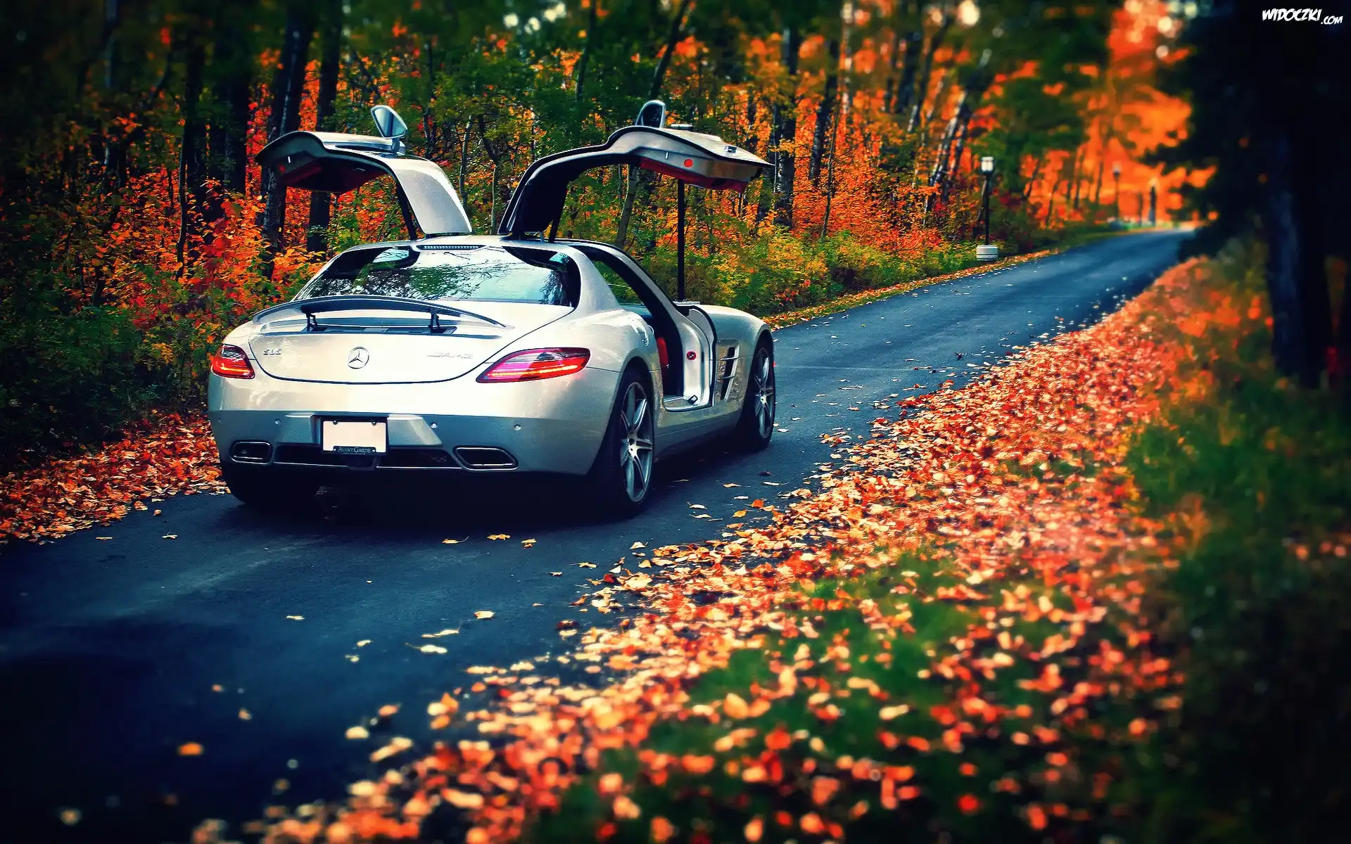 Mercedes, SLS, Las, Droga, Liście, Jesień