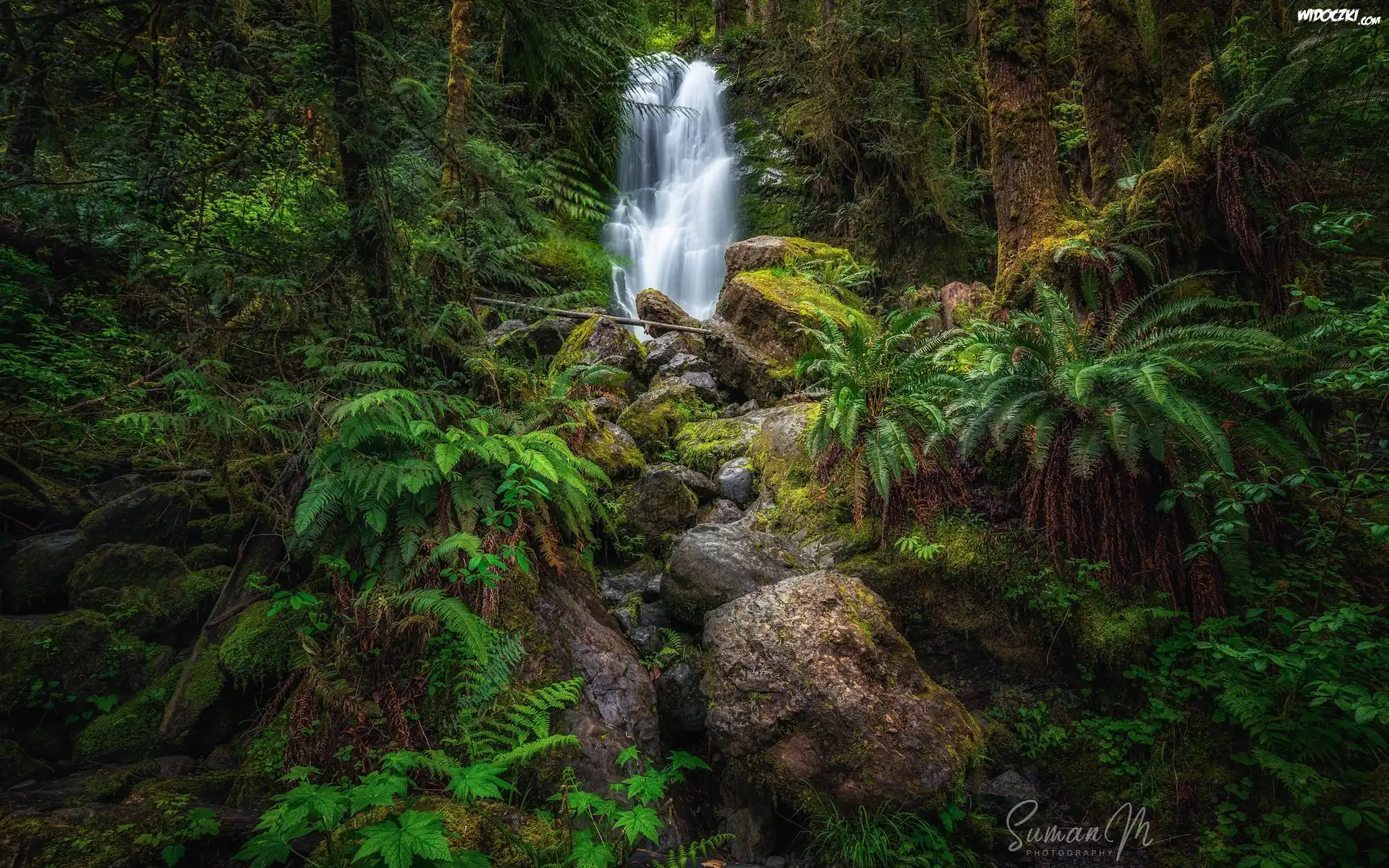 Las, Wodospad, Merriman Falls, Kamienie, Roślinność, Paprocie, Stan Waszyngton, Stany Zjednoczone |