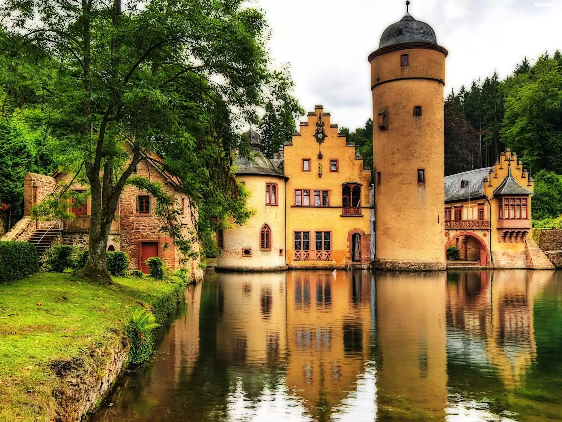 Zdjęcia, Niemcy, Bawaria, Zamek wodny Mespelbrunn Castle, Rzeka Elsava, Odbicie