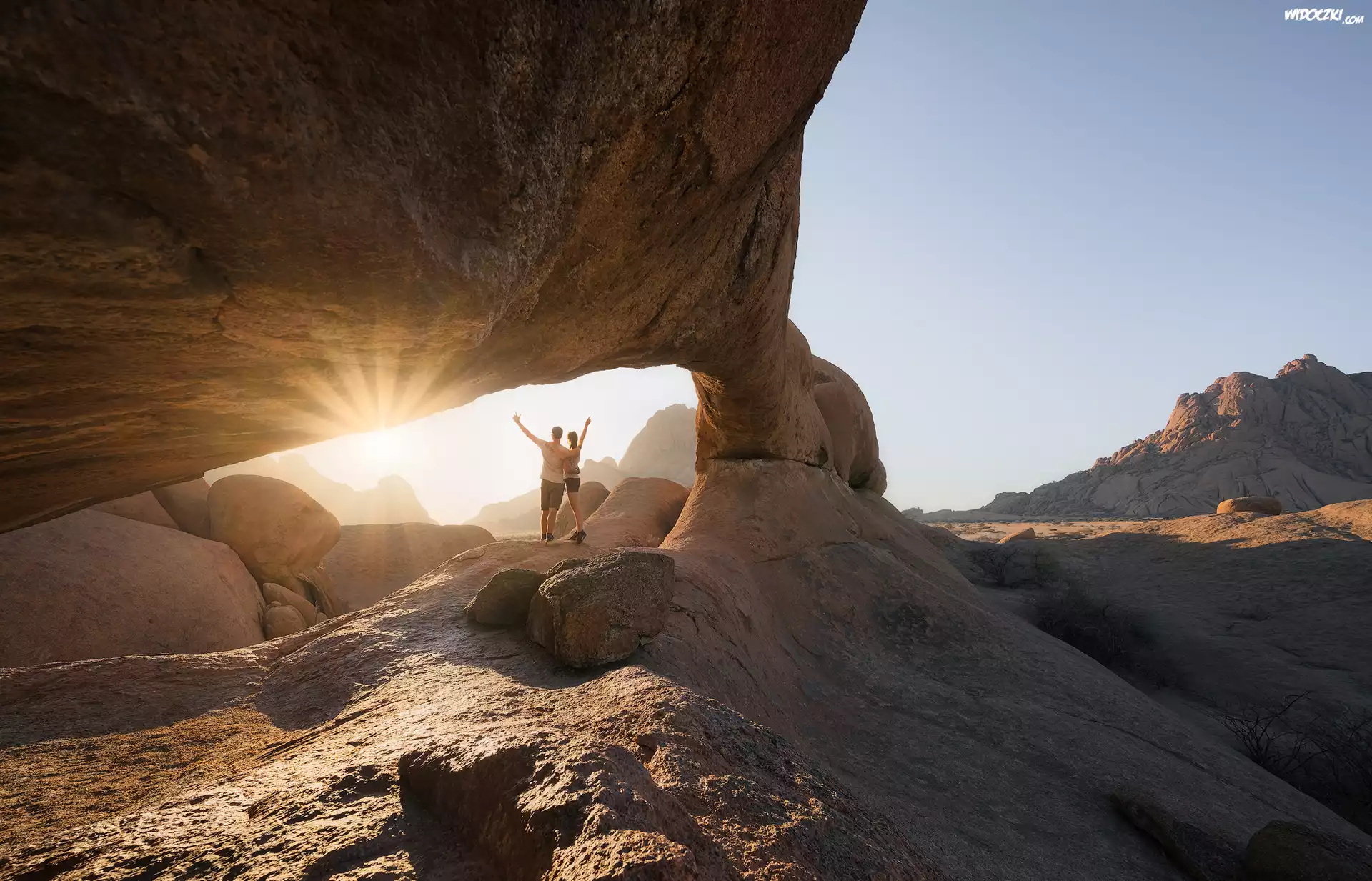 Góry, Skały, Kamienie, Promienie słońca, Mężczyzna, Kobieta, Rezerwat przyrody Spitzkoppe, Republika Namibii |