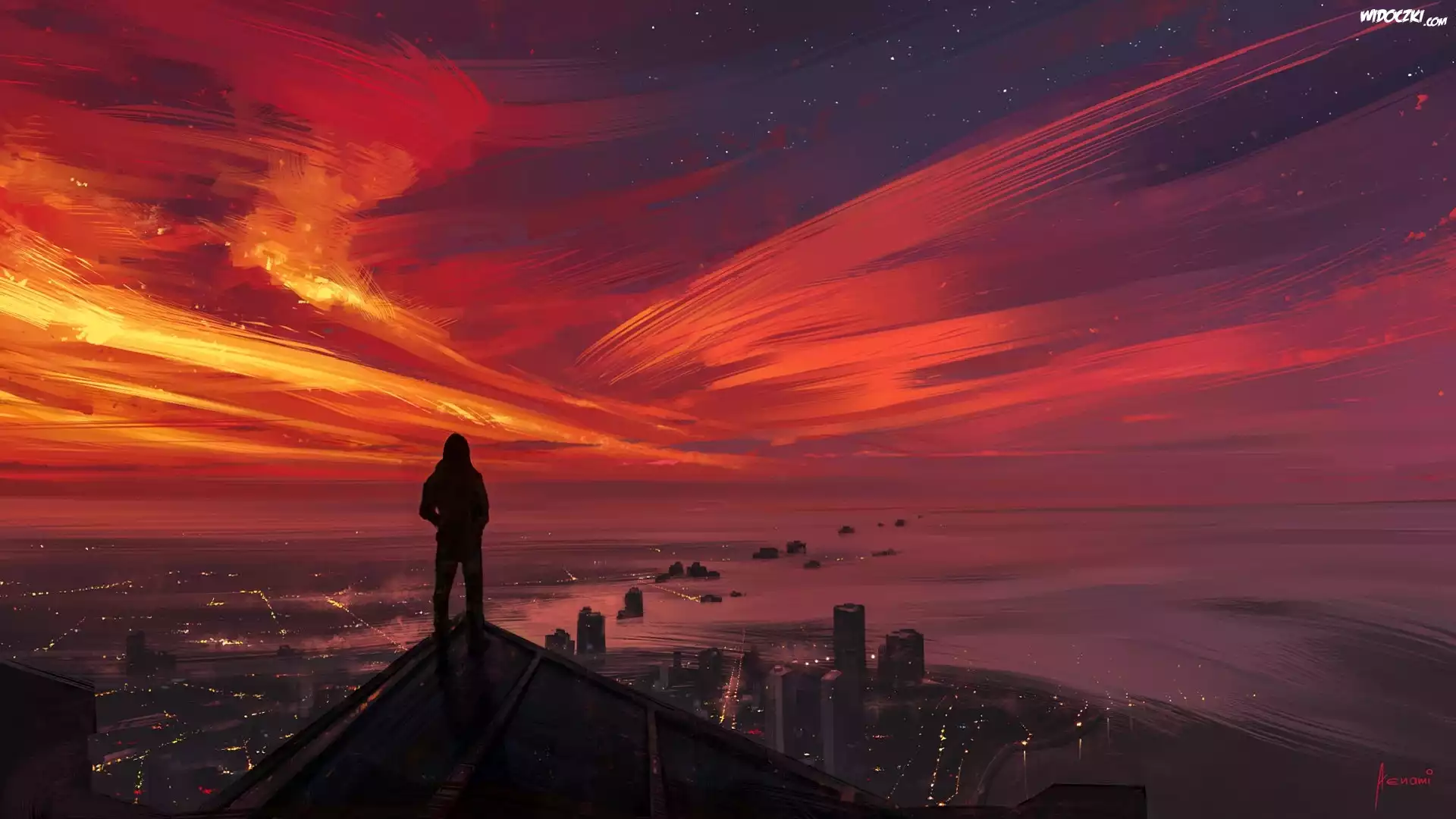 Mężczyzna, Dach, Miasto, Zachód słońca