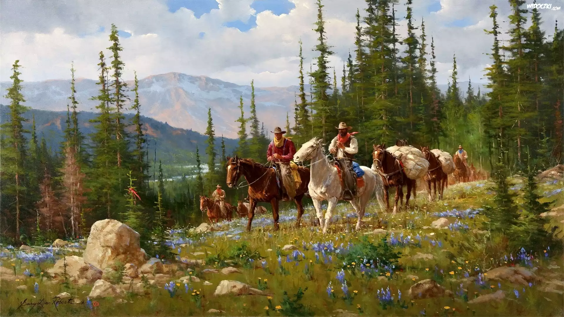 Zdjęcia, Mężczyzni, Konie, Las, Góry