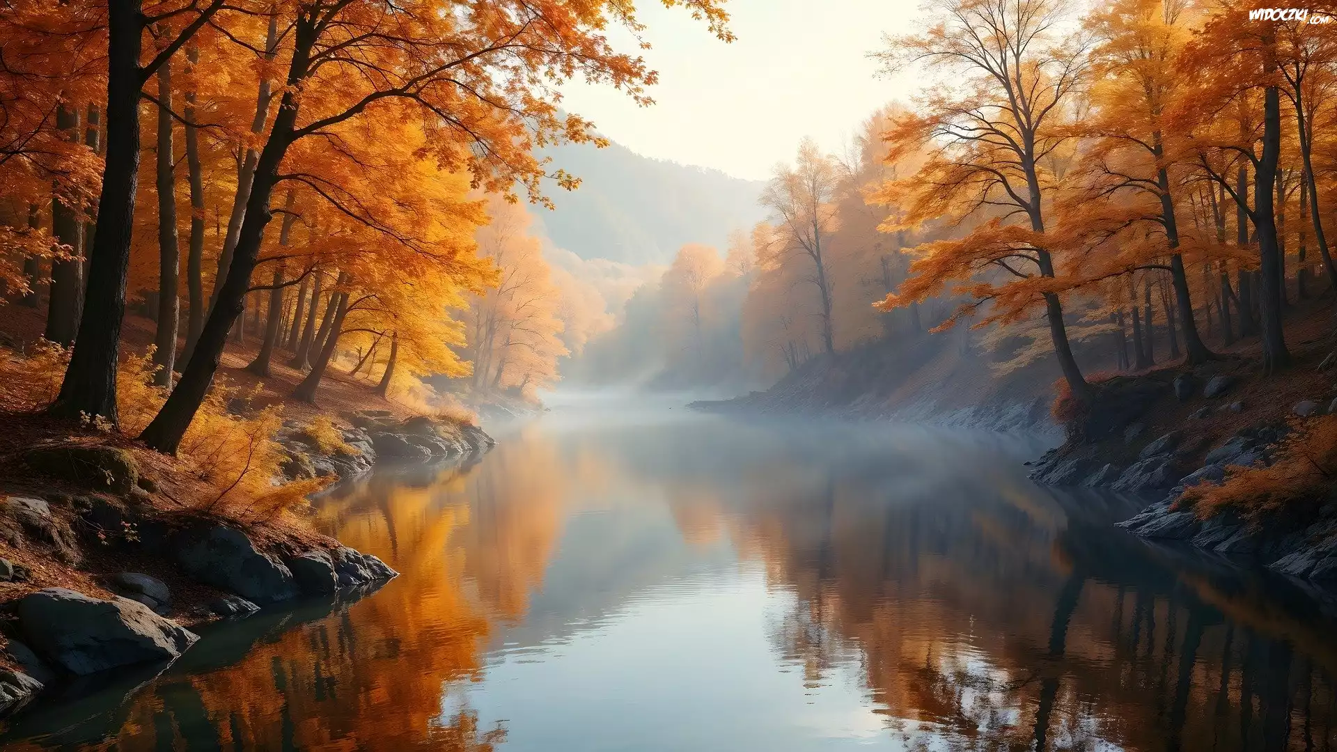 Jesień, Rzeka, Drzewa, Mgła, Grafika AI