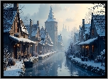 Kanał, Domy, Zima, Mgła, Grafika AI