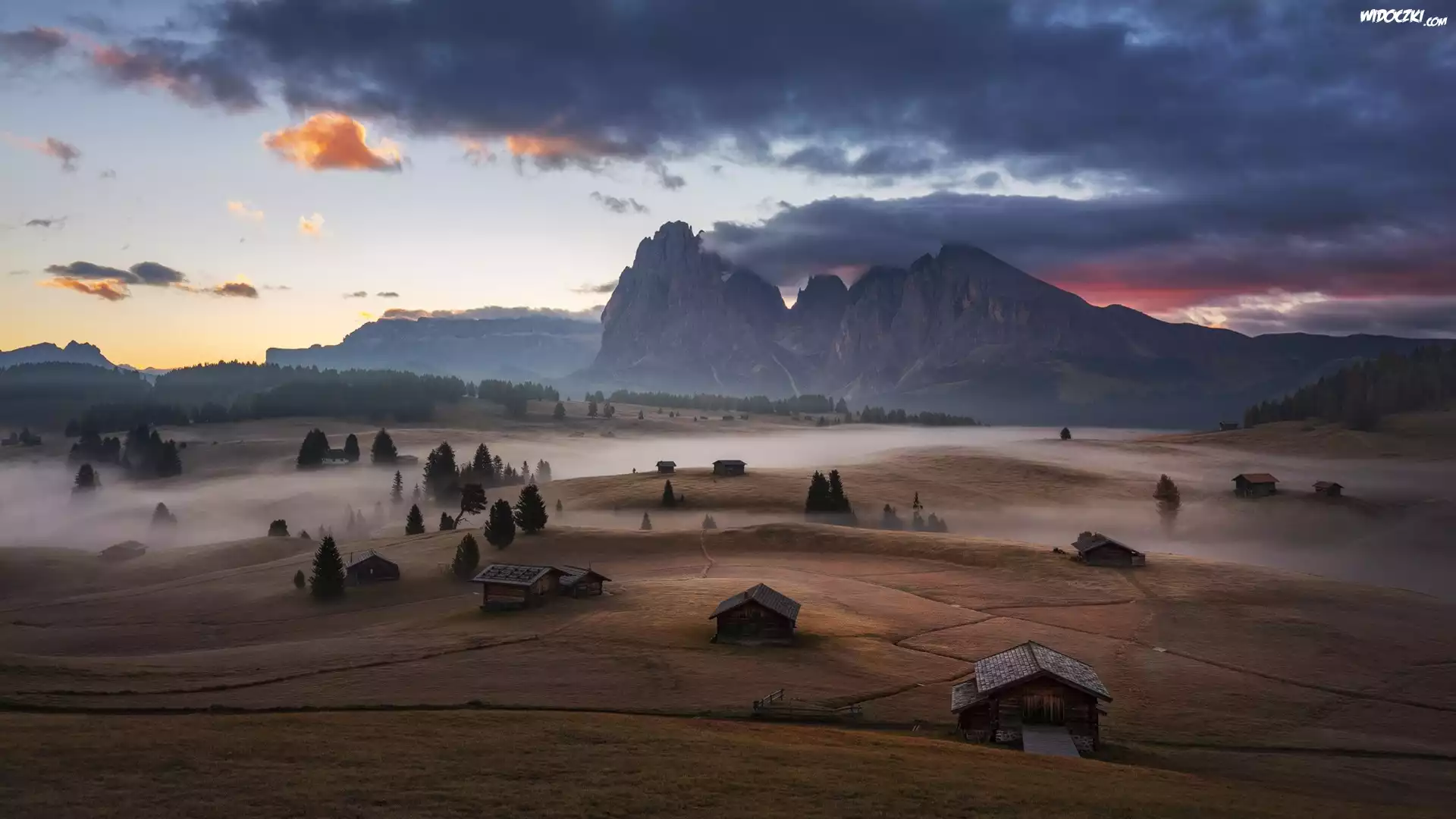 Zdjęcia, Mgła, Góry Sassolungo, Dolomity, Drewniane, Domki, Płaskowyż Seiser Alm, Dolina Val Gardena, Włochy