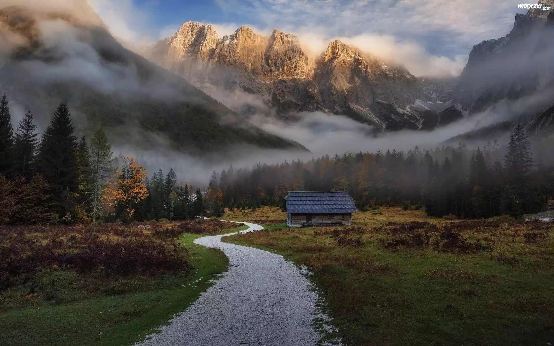 Góry, Las, Drzewa, Mgła, Dom, Droga