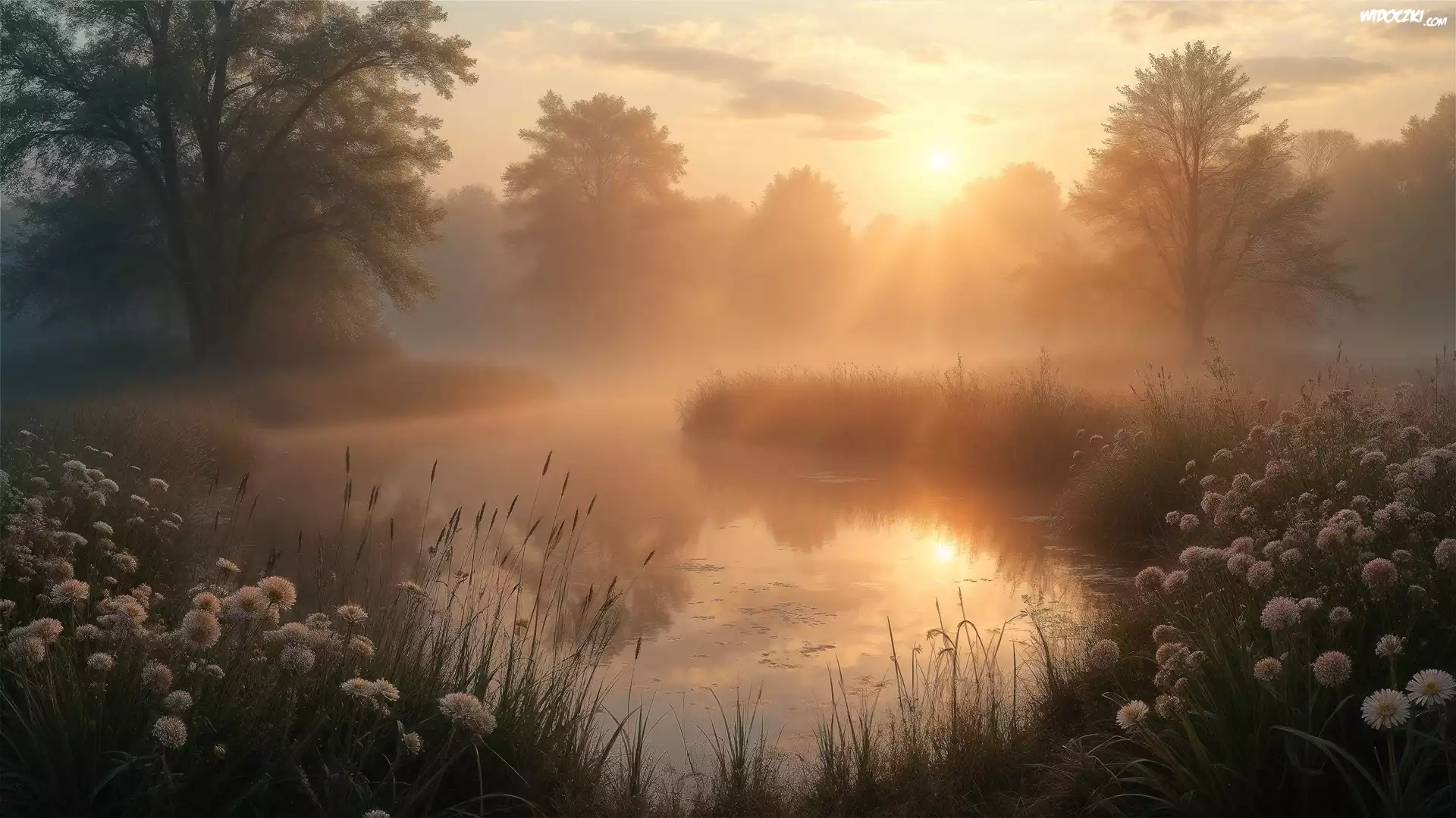 Zdjęcia, Jezioro, Rośliny, Drzewa, Mgła, Świt, Grafika AI
