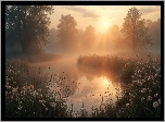 Jezioro, Rośliny, Drzewa, Mgła, Świt, Grafika AI