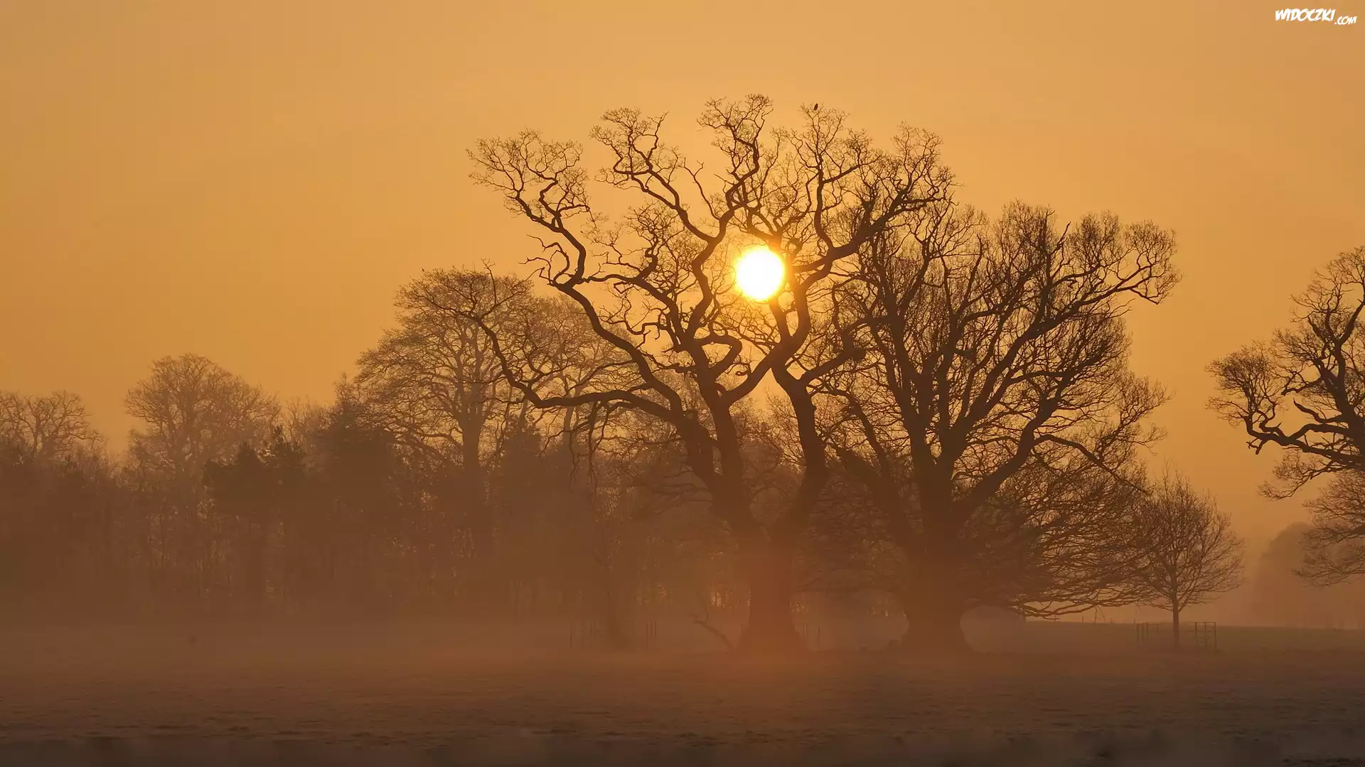 Zdjęcia, Mgła, Wschód, Słońca, Park, Drzewa, Drzewo