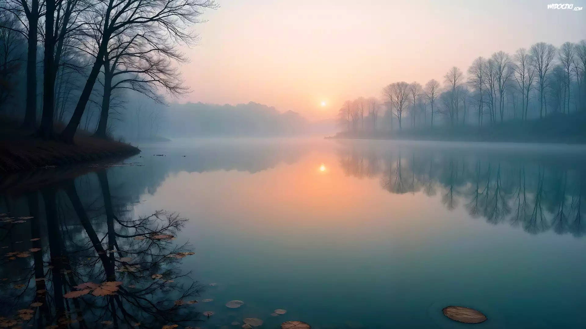 Jezioro, Mgła, Drzewa, Zachód słońca