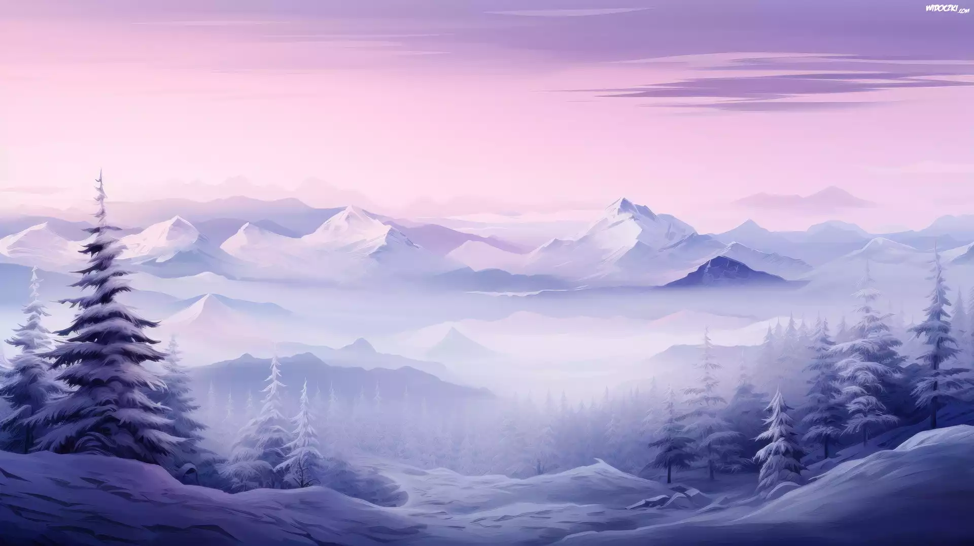Zima, Mgła, Góry, Drzewa, 2D
