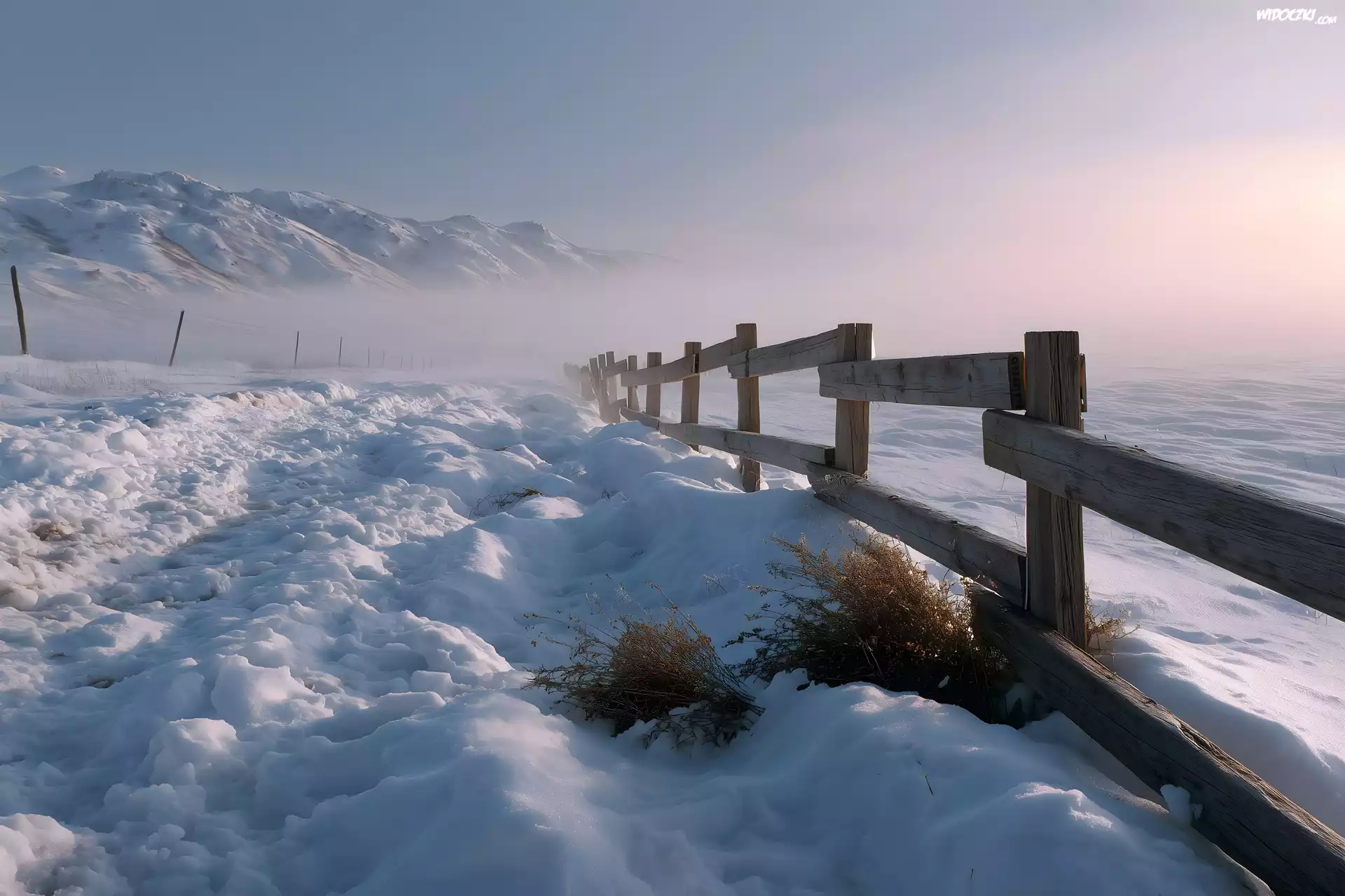 Zdjęcia, Zima, Ogrodzenie, Góry, Mgła, Rośliny, Grafika AI