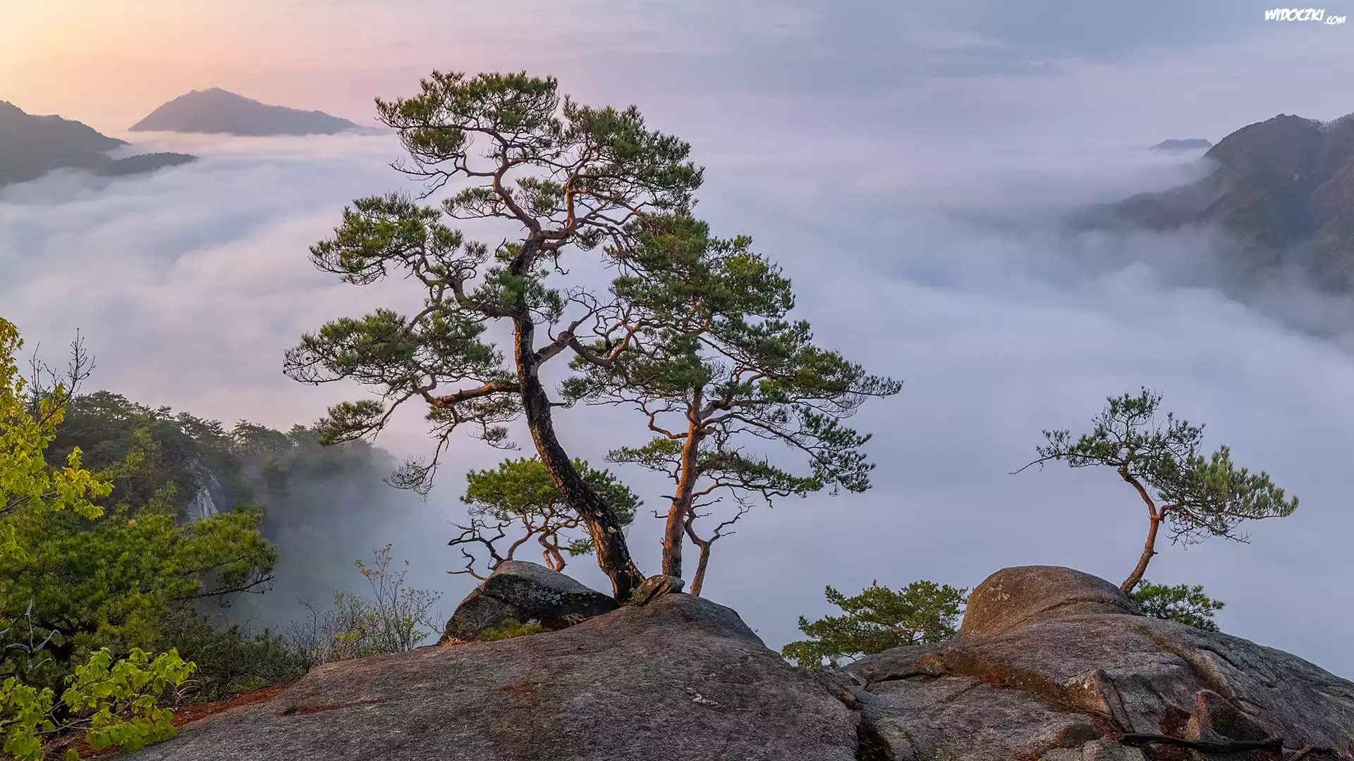 Zdjęcia, Góry, Sosna, Skały, Mgła