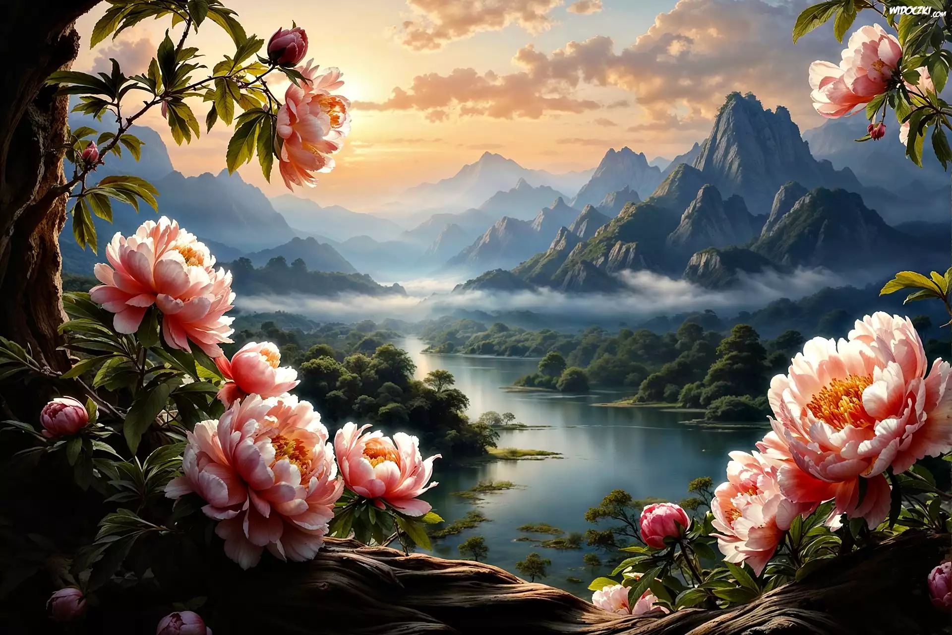 Zdjęcia, Piwonie, Kwiaty, Rzeka, Mgła, Góry, Grafika