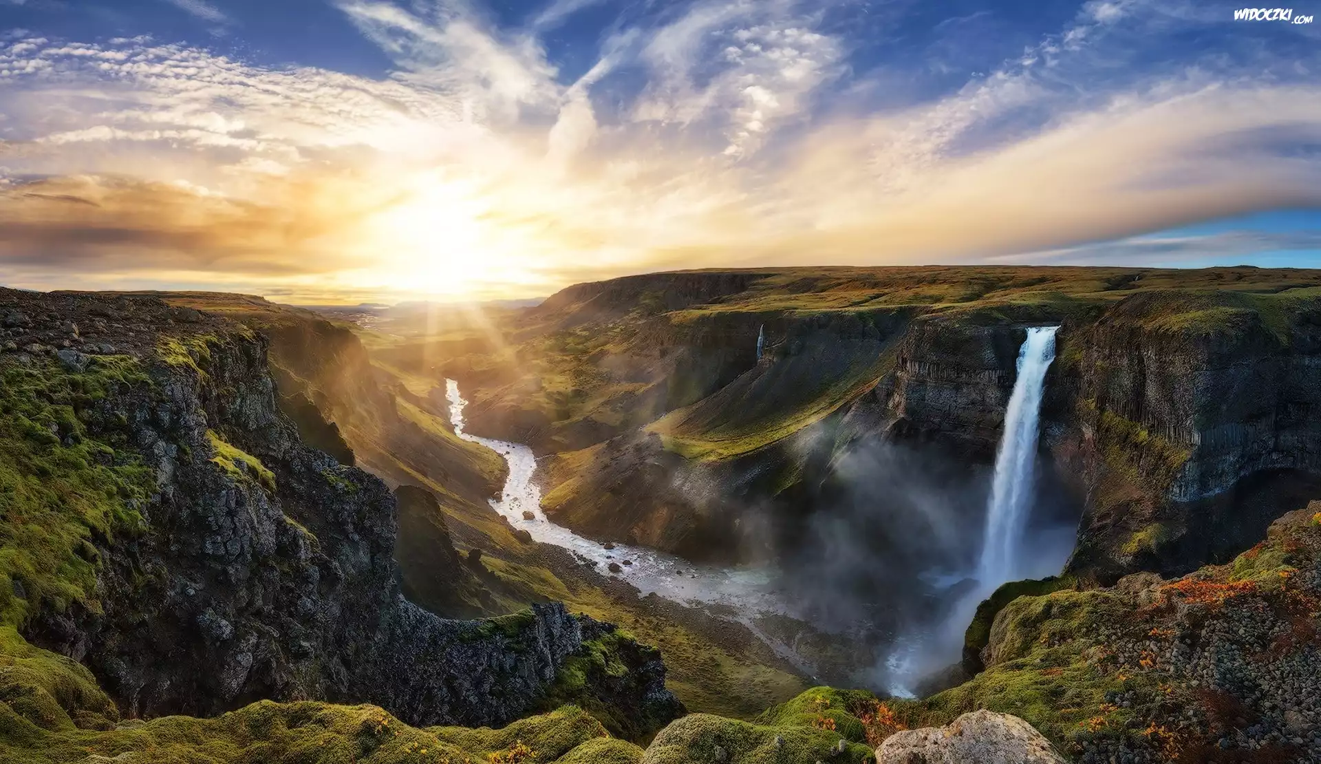 Zdjęcia, Islandia, Rzeka Fossá, Wodospad Háifoss, Wschód słońca, Chmury, Mgła