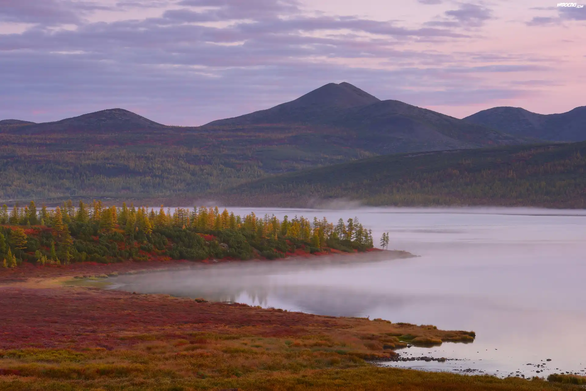 Góry, Jesień, Mgła, Jezioro, Jack London Lake, Kołyma, Obwód magadański, Rosja