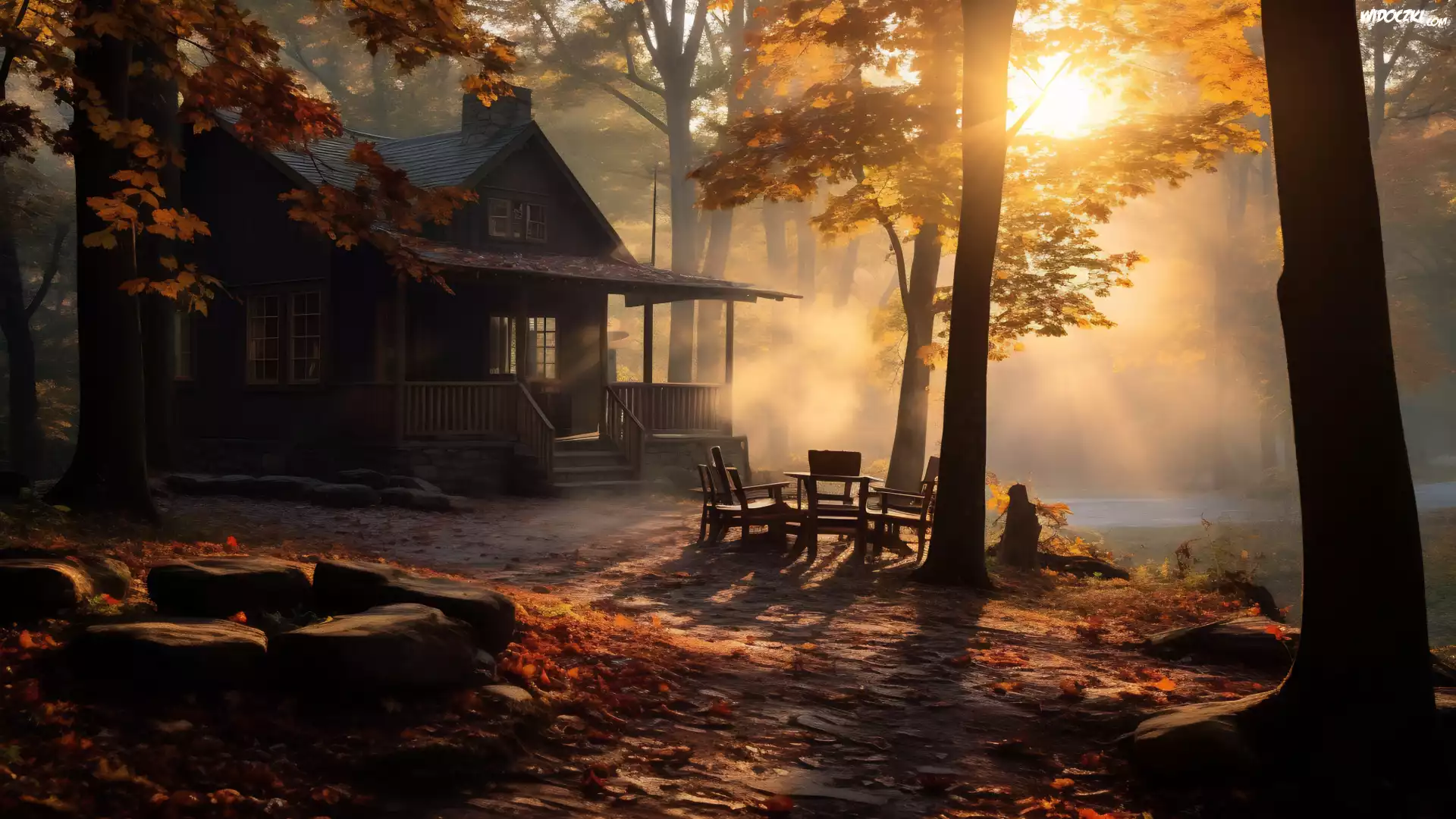 Zdjęcia, Jesień, Dom, Jezioro, Mgła, Zachód słońca, Drzewa
