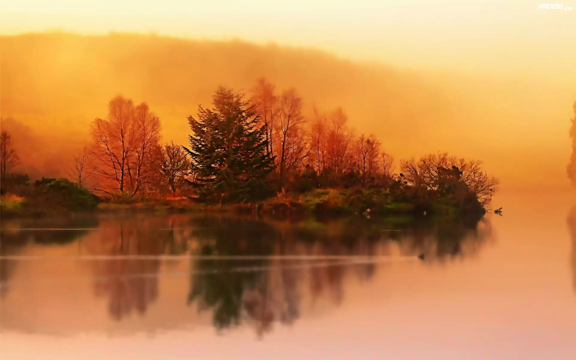 Zdjęcia, Jezioro, Mgła, Drzewa