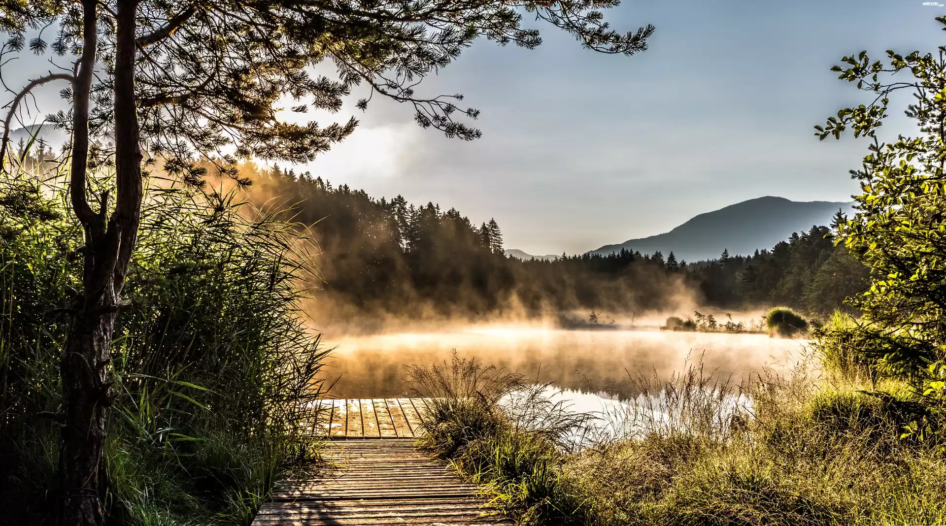 Jezioro, Mgła, Góry, Drzewa, Przebijające światło, Roślinność
