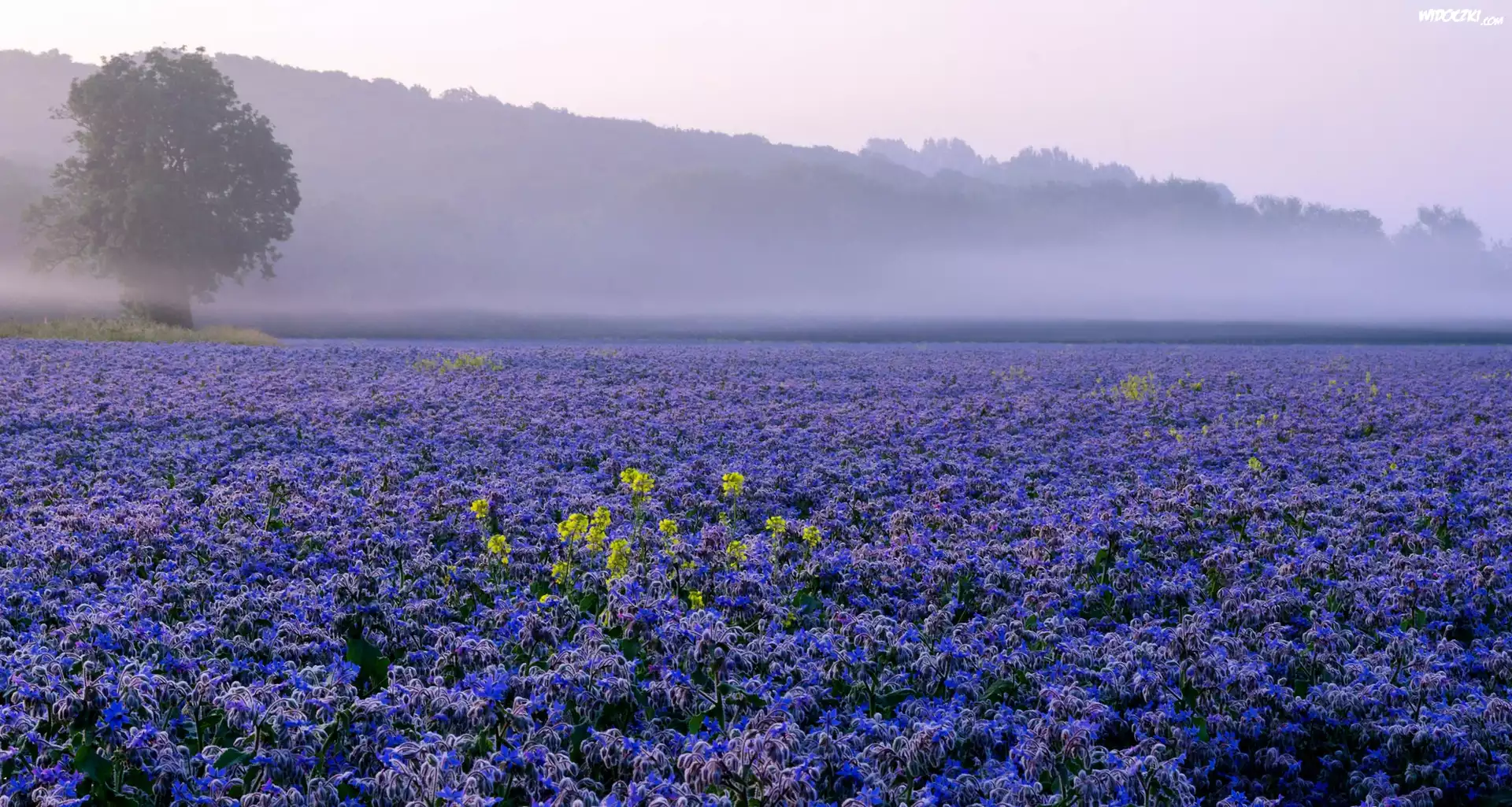 Zdjęcia, Łąka, Kwiaty, Mgła, Drzewa