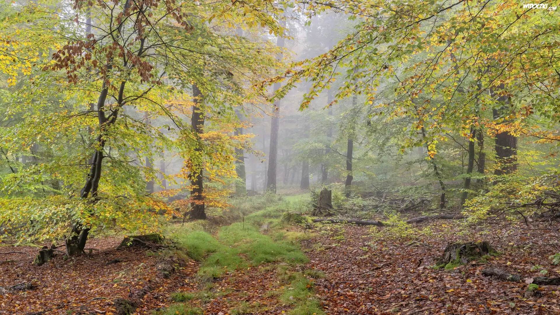 Zdjęcia, Jesień, Las, Drzewa, Mgła, Opadłe, Liście