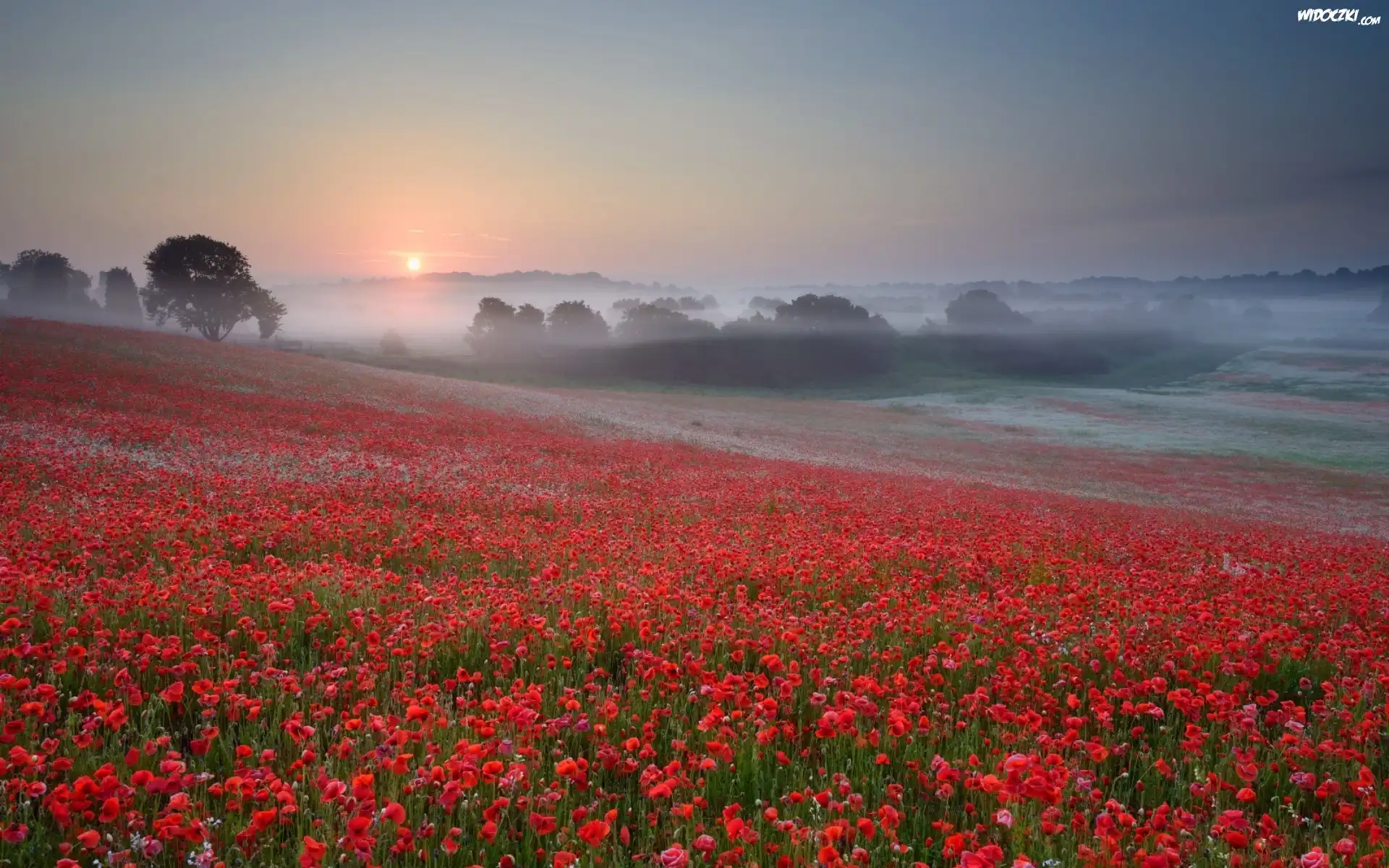 Zdjęcia, Maki, Mgła, Łąka