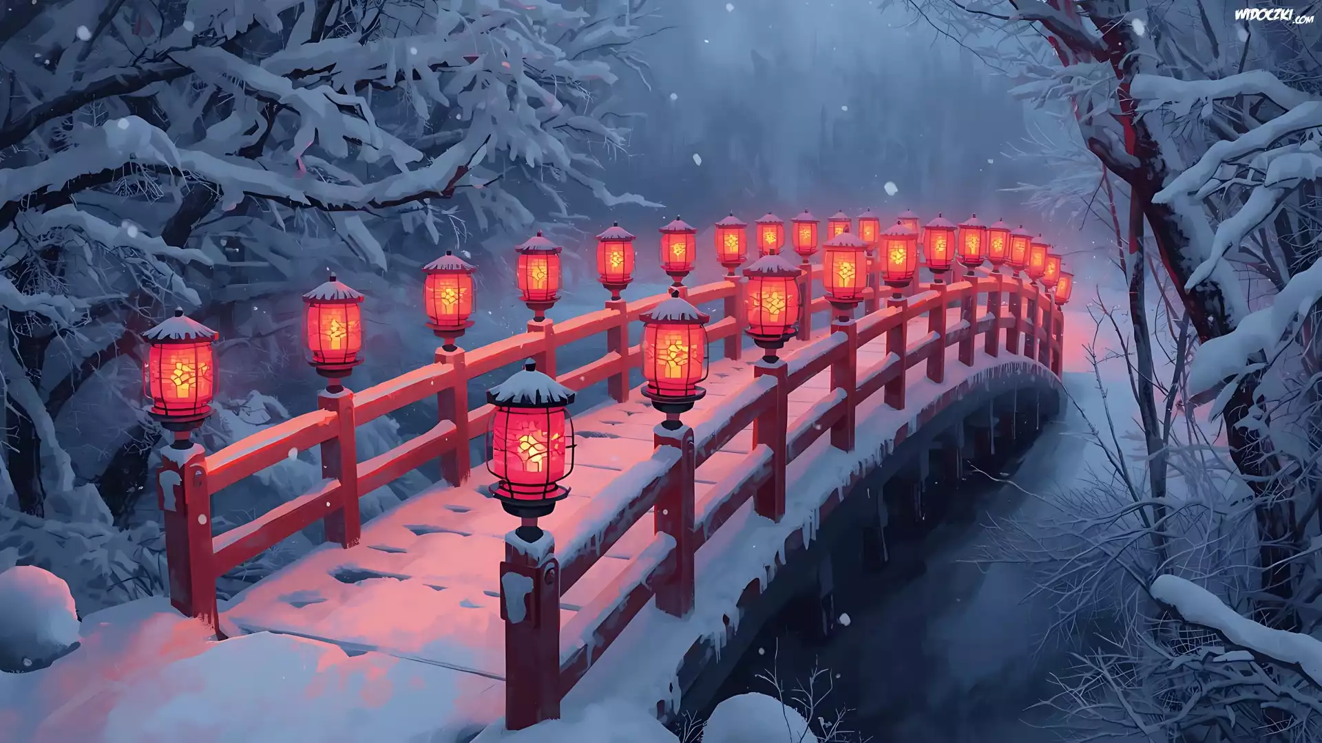 Zima, Śnieg, Most, Latarnie, Rzeka, Ośnieżone, Drzewa, Mgła
