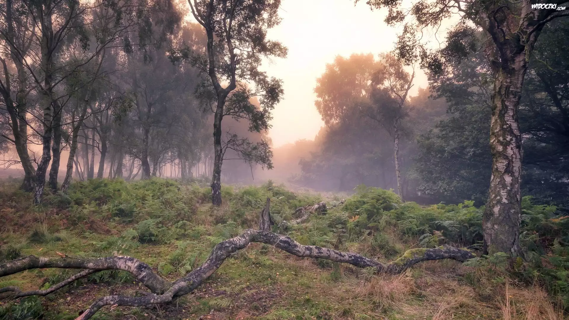 Zdjęcia, Anglia, Hrabstwo Derbyshire, Park Narodowy Peak District, Las, Jesień, Mgła