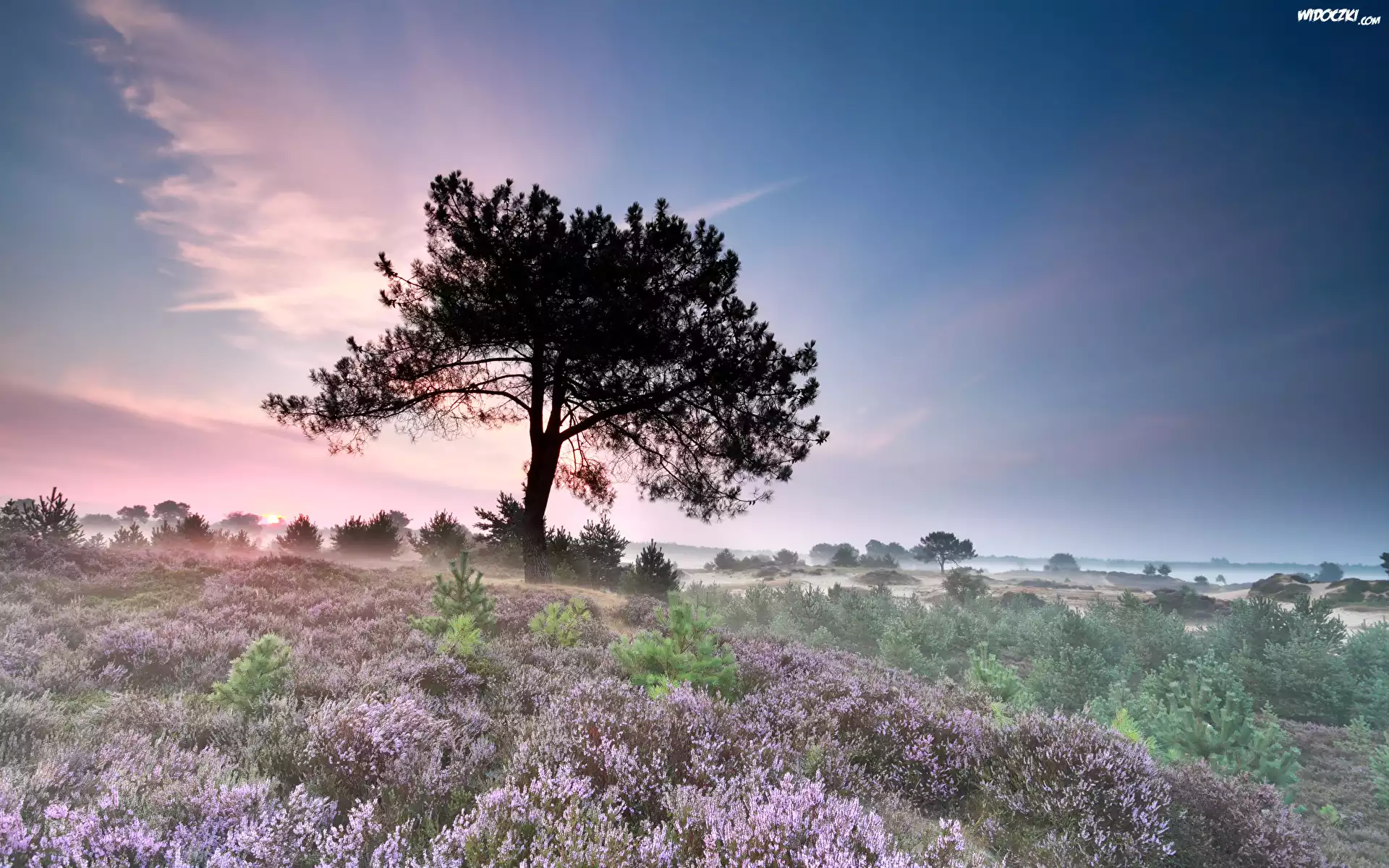 Zdjęcia, Holandia, Park Narodowy Drents-Friese Wold, Wrzosowisko, Drzewo, Mgła