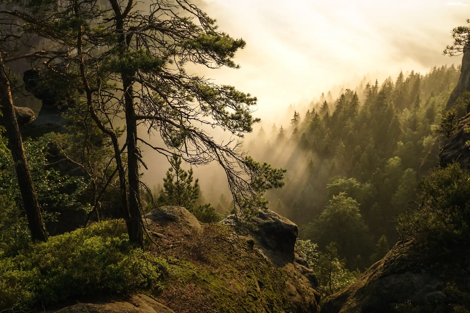 Zdjęcia, Niemcy, Park Narodowy Saskiej Szwajcarii, Góry Połabskie, Drzewa, Mgła