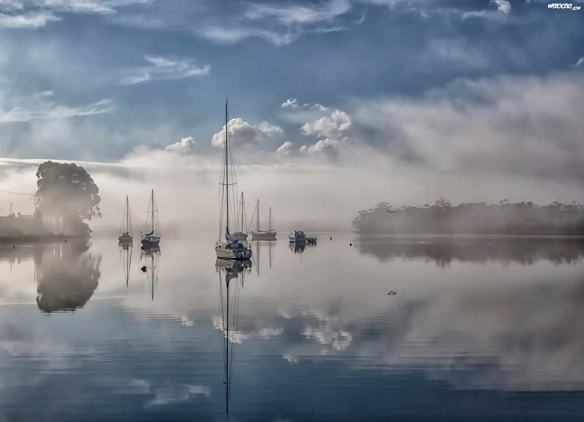 Zdjęcia, Mgła, Jachty, Łódki, Jezioro