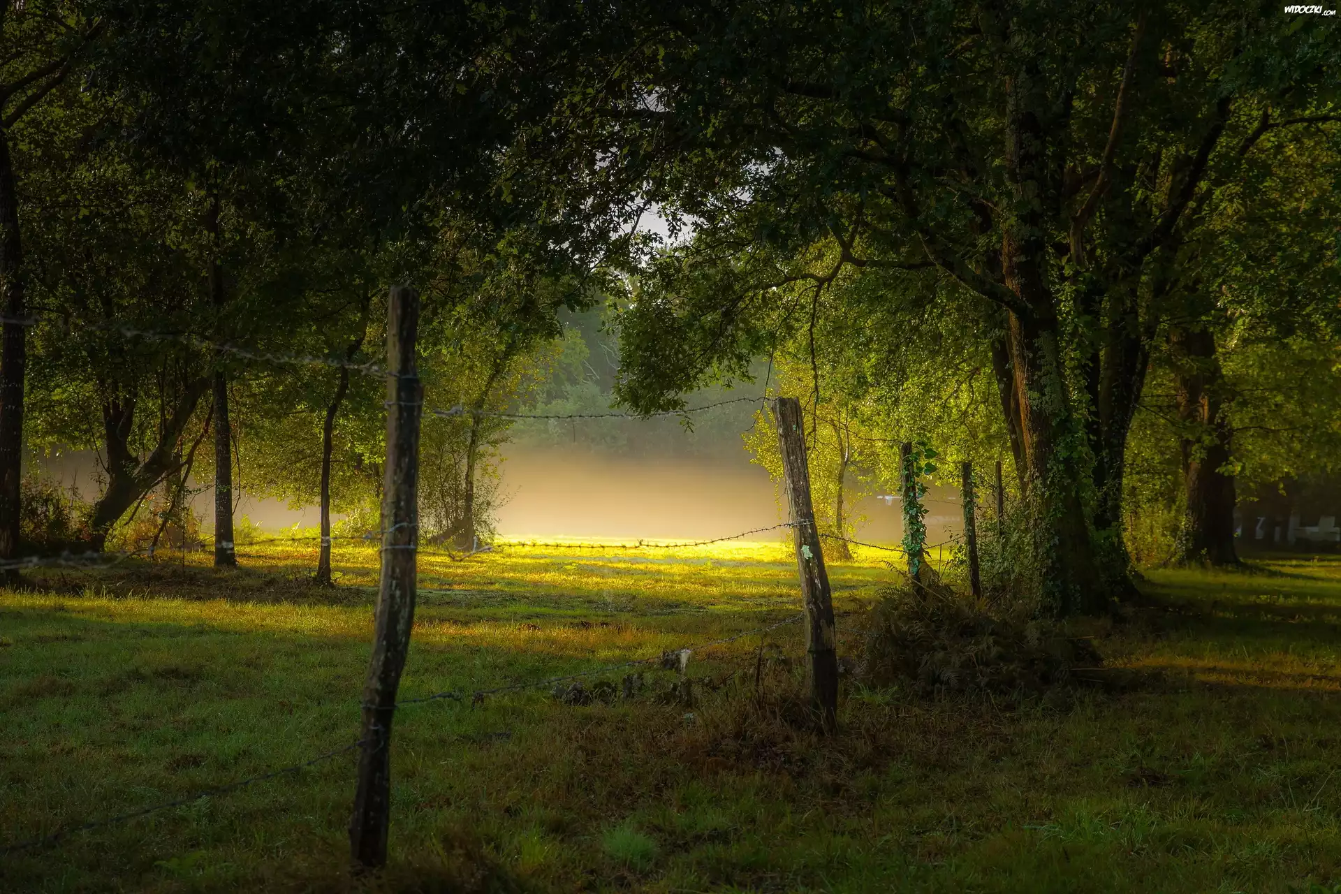 Zdjęcia, Ogrodzenie, Mgła, Drzewa