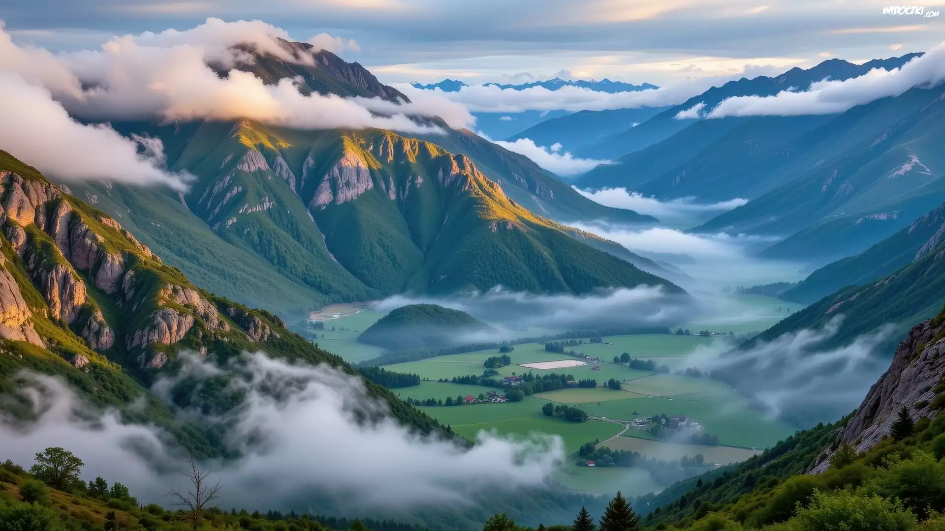 Góry, Chmury, Opadająca, Mgła, Dolina, Domy, Drzewa