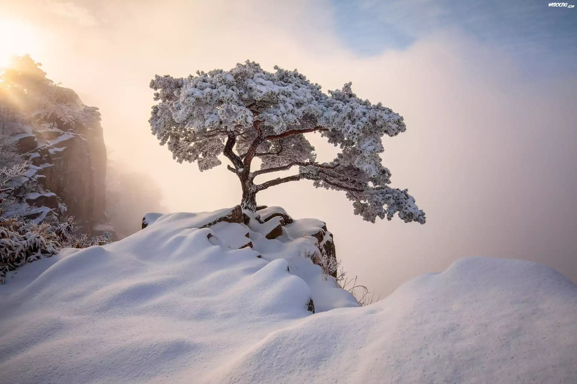 Zdjęcia, Zima, Góry, Mgła, Drzewo, Park prowincjonalny Daedunsan, Jeolla Północna, Korea Południowa