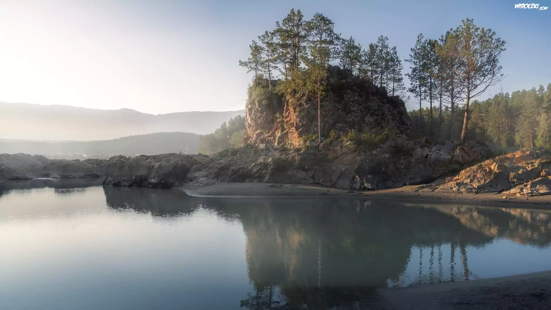 Zdjęcia, Poranek, Mgła, Skała, Drzewa, Rzeka Katuń, Rosja