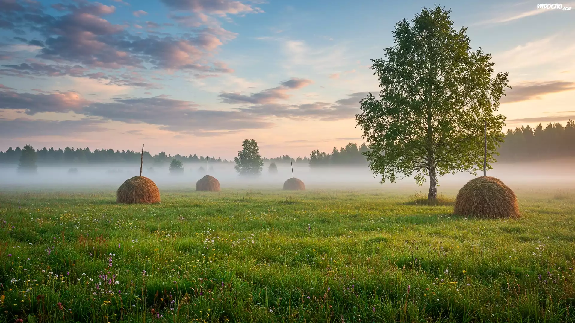 Łąka, Mgła, Poranek, Snopki, Siano