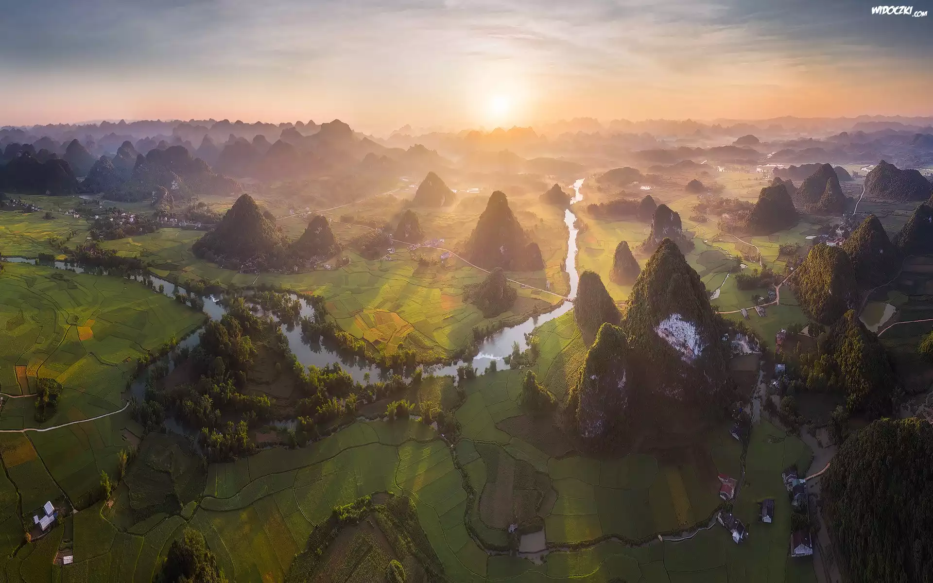 Zdjęcia, Kręta, Rzeka, Pola, Góry, Wschód słońca, Mgła, Prowincja Cao Bang, Wietnam