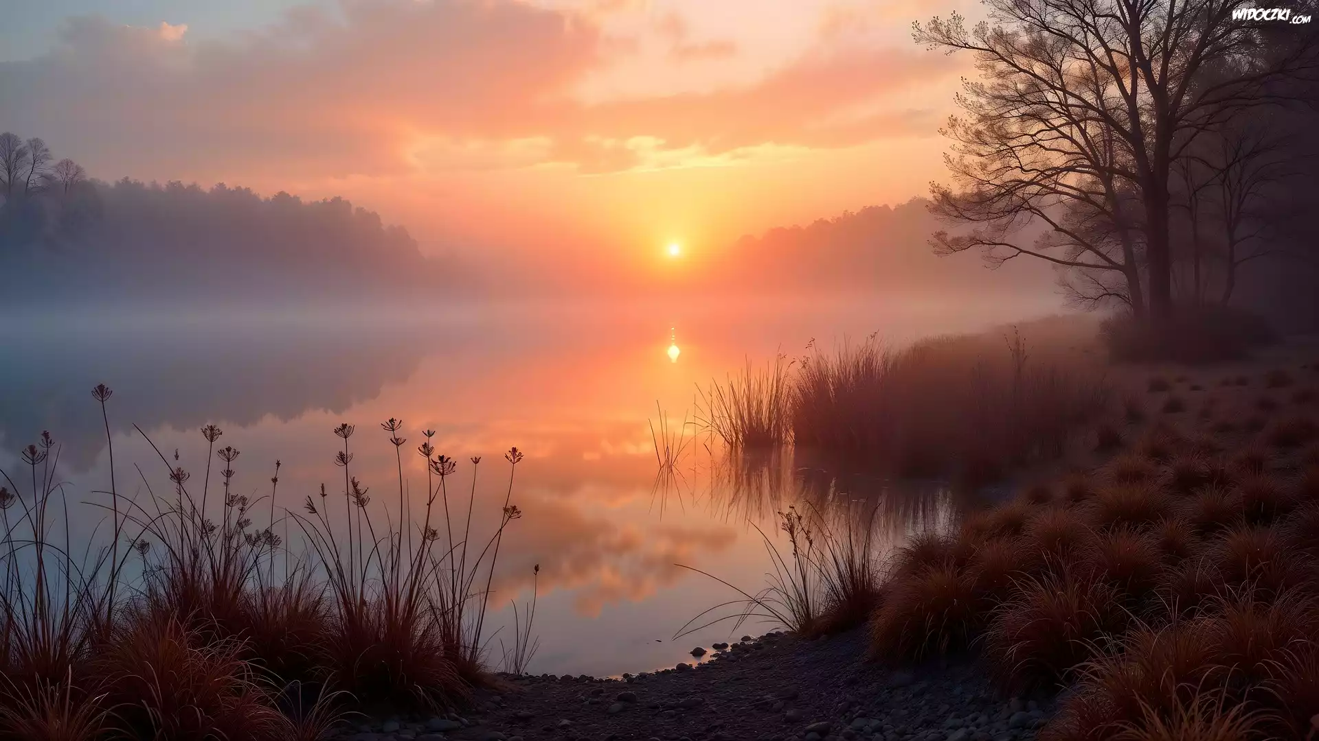 Wschód słońca, Jezioro, Mgła, Drzewa, Rośliny