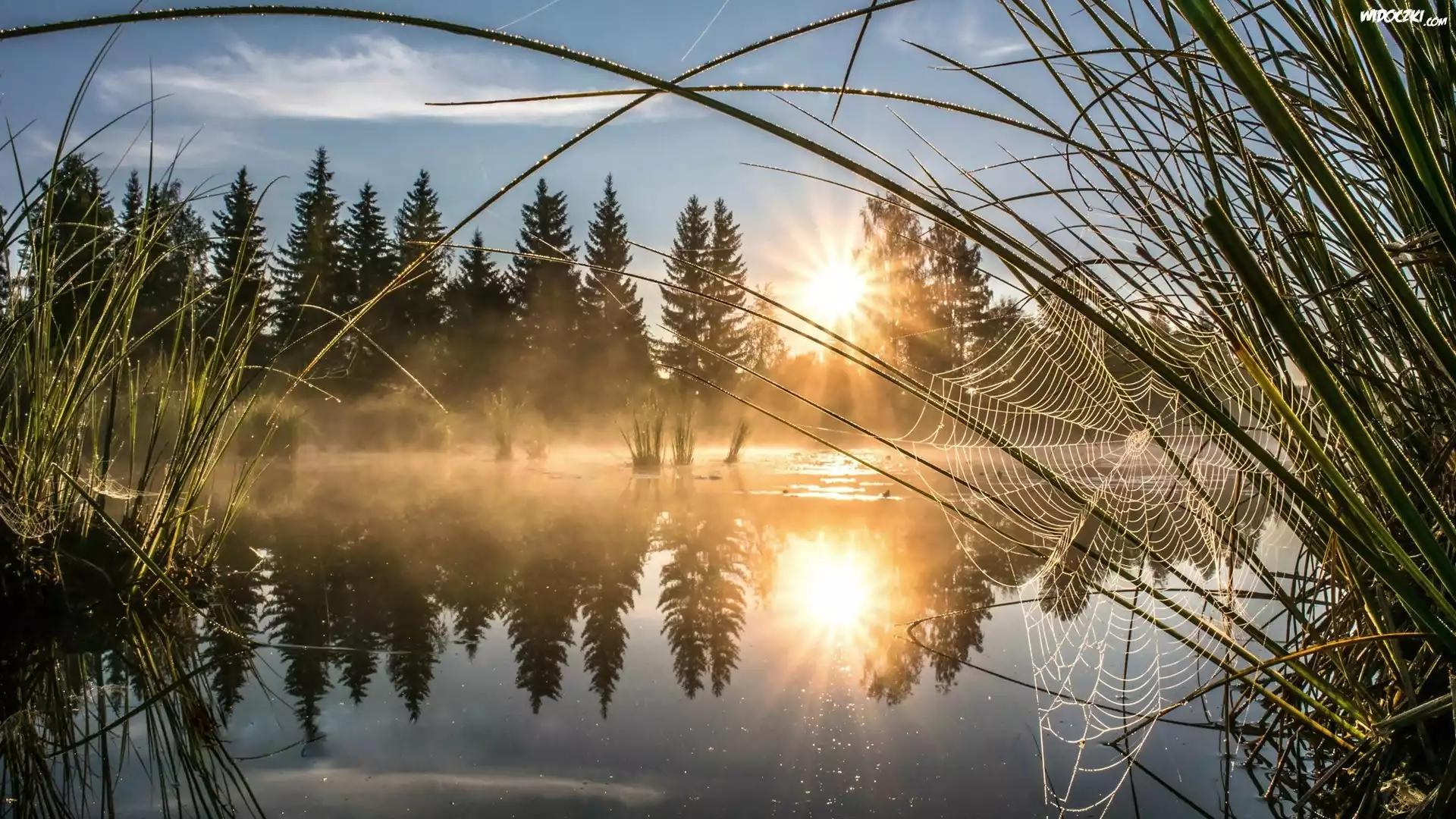 Zdjęcia, Rzeka, Mgła, Promienie słońca, Trawy, Pajęczyna, Drzewa