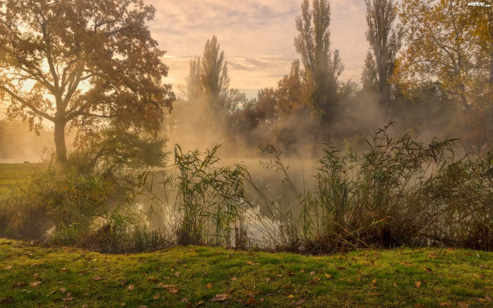 Zdjęcia, Rzeka, Mgła, Świt, Drzewa, Trawa, Trzciny, Liście