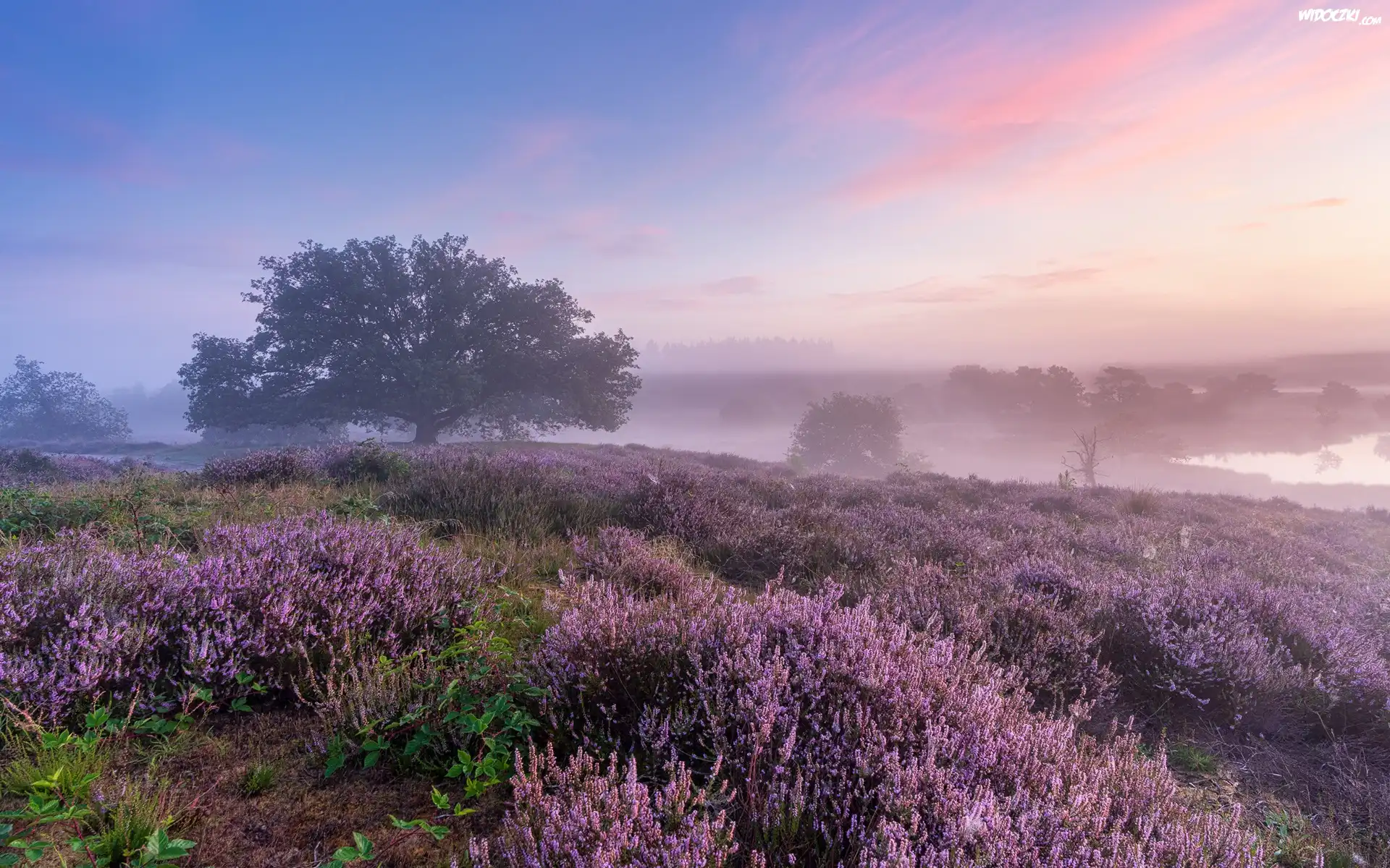Zdjęcia, Wrzosy, Wrzosowisko, Drzewa, Mgła, Wschód słońca